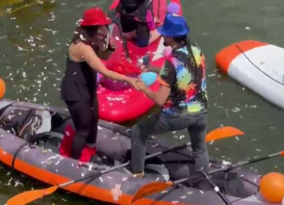 Karnavalda, kanoyla korteje katılan atletlerden Bünyamin Türk, 7 aylık sevgilisi Betül Sakınan’a evlenme teklifi etti.
