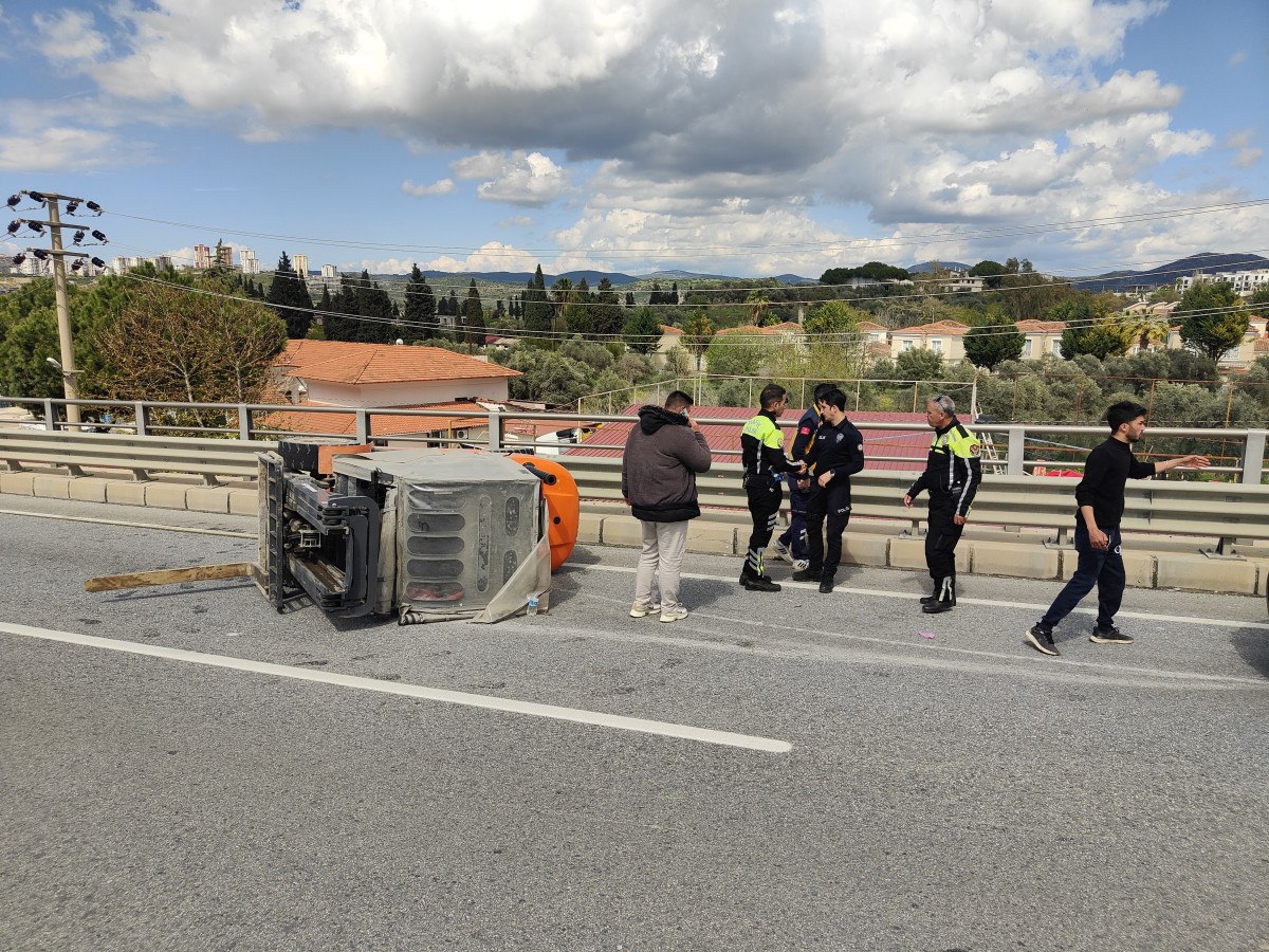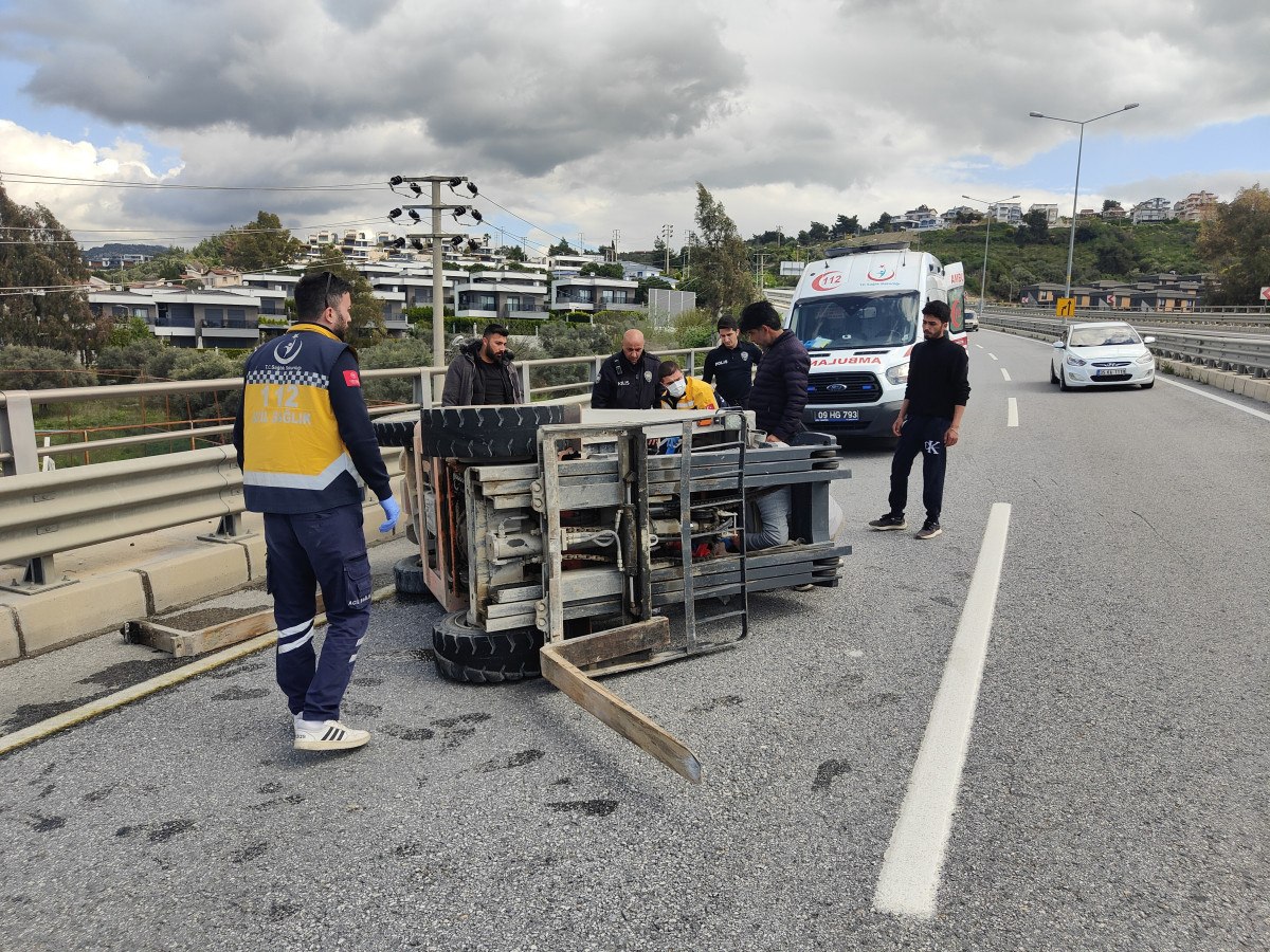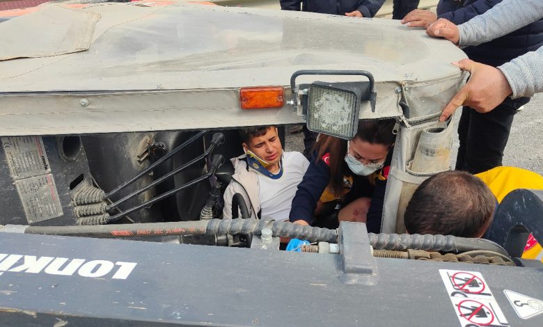 Devrilen aracın altında kalan genç emekçi, etraftakilerin yardımıyla kurtarıldı.