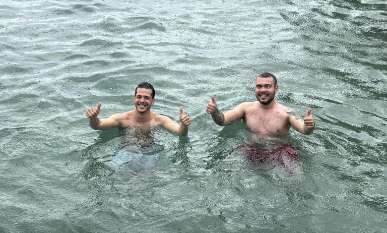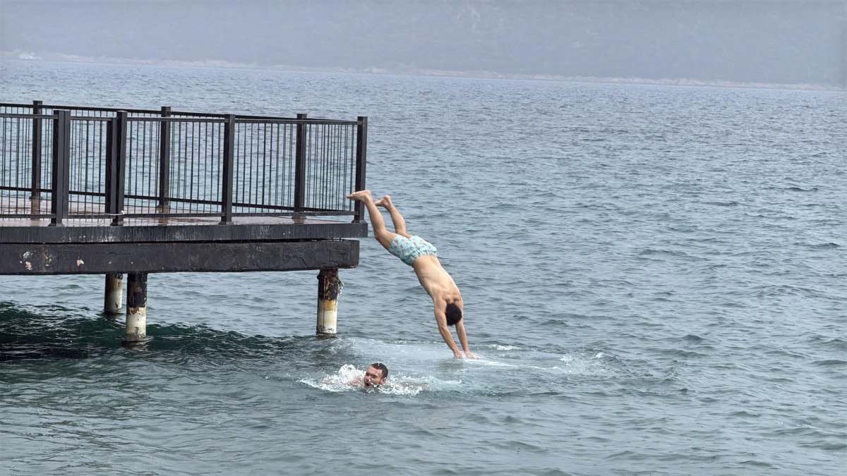 Doğancan Akyel ile Enes Türker, İçmeler Kıyısı’nda kuvvetli sağanağa karşın iskeleden suya atlayarak denize girdi.