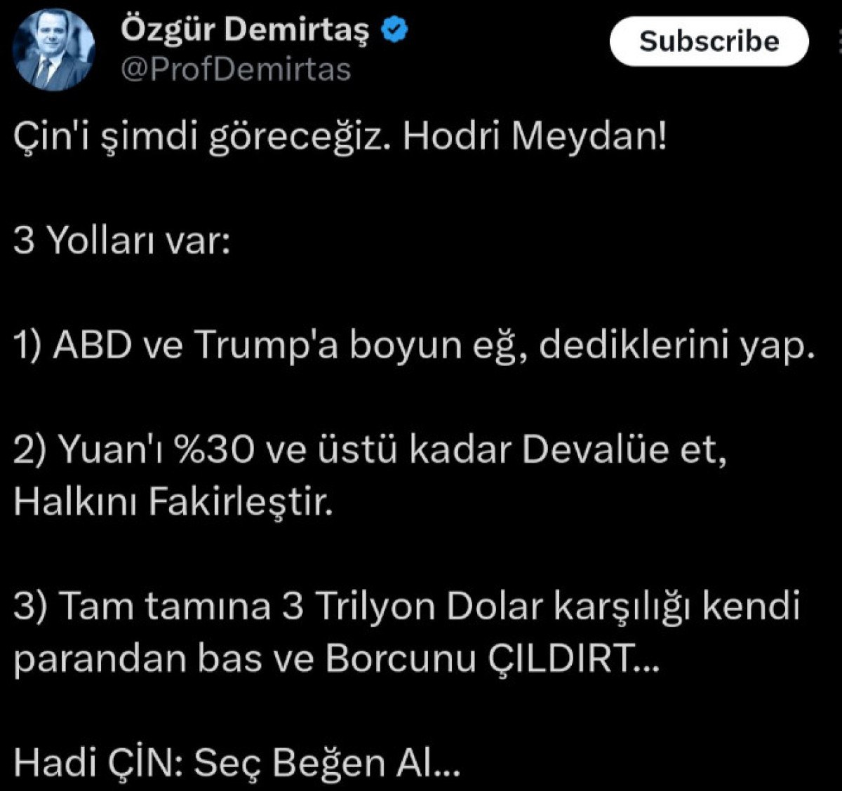 ABD Başkanı Donald Trump’ın Çin’e uyguladığı vergi tarifesi sonrası, toplumsal medya hesabından Çin iktisadı ile alakalı bir paylaşımda bulunan Demirtaş’ın tahlili kopya çıktı.