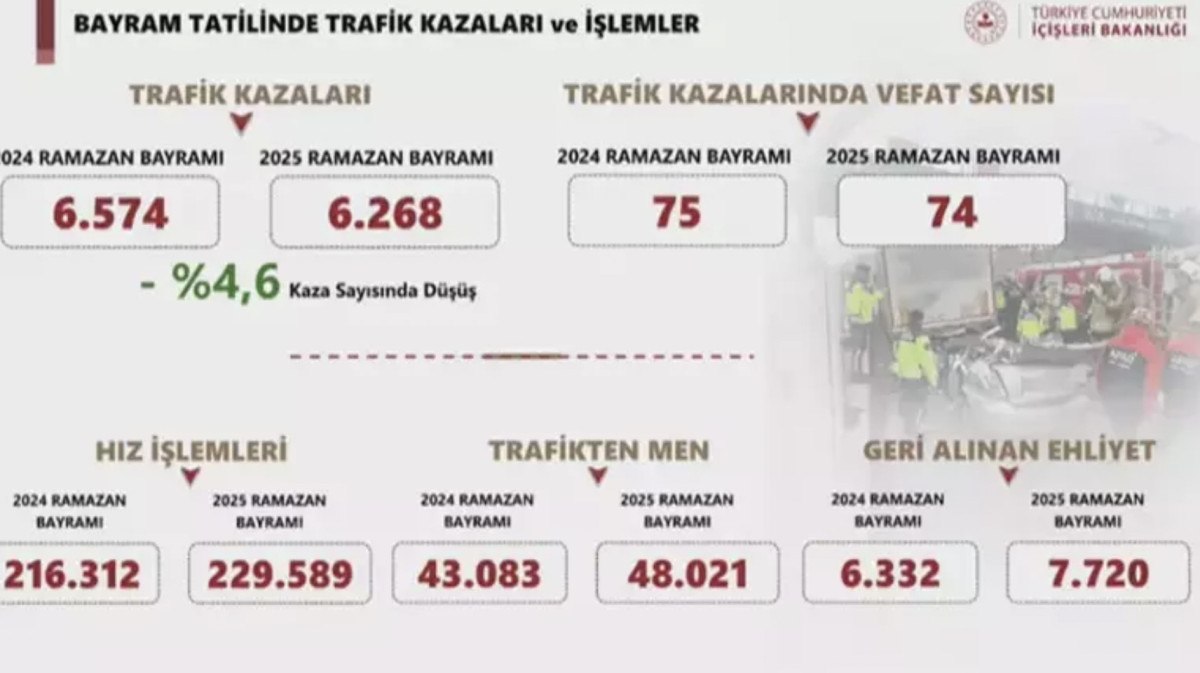 Bakan Yerlikaya’nın açıklamasına göre bayram tatili mühleti boyunca meydana gelen kazalarda 74 kişi hayatını kaybetti.