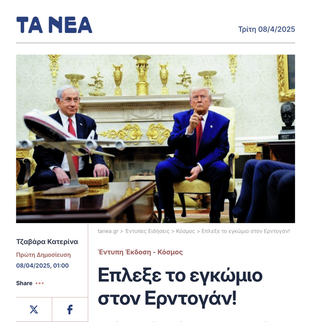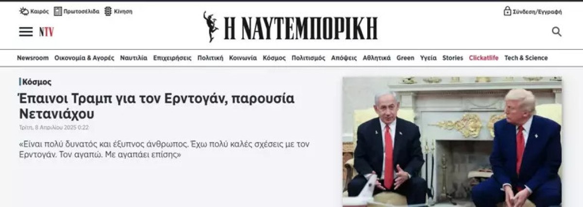 Yunanistan merkezli Naftemporiki gazetesi, Donald Trump’ın açıklamalarını, “Trump Netanyahu’nun gözü önünde Erdoğan’ı övdü” başlığı ile öne çıkardı.
