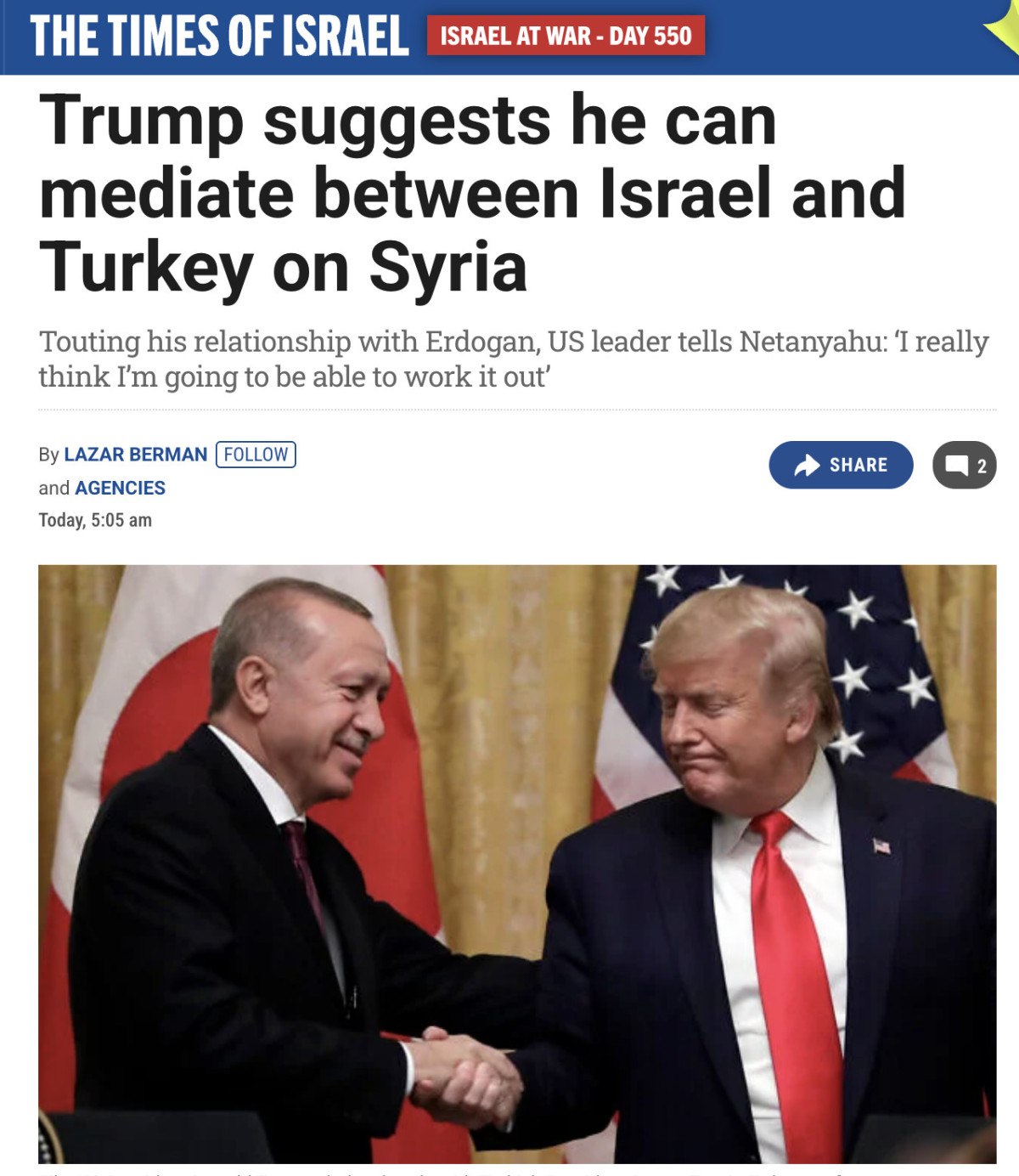 Times of Israel haberi, “Trump Erdoğan ile kusursuz alakaları olduğunu söylüyor” başlığı ile manşetlerinde birinci sıraya taşıdı.