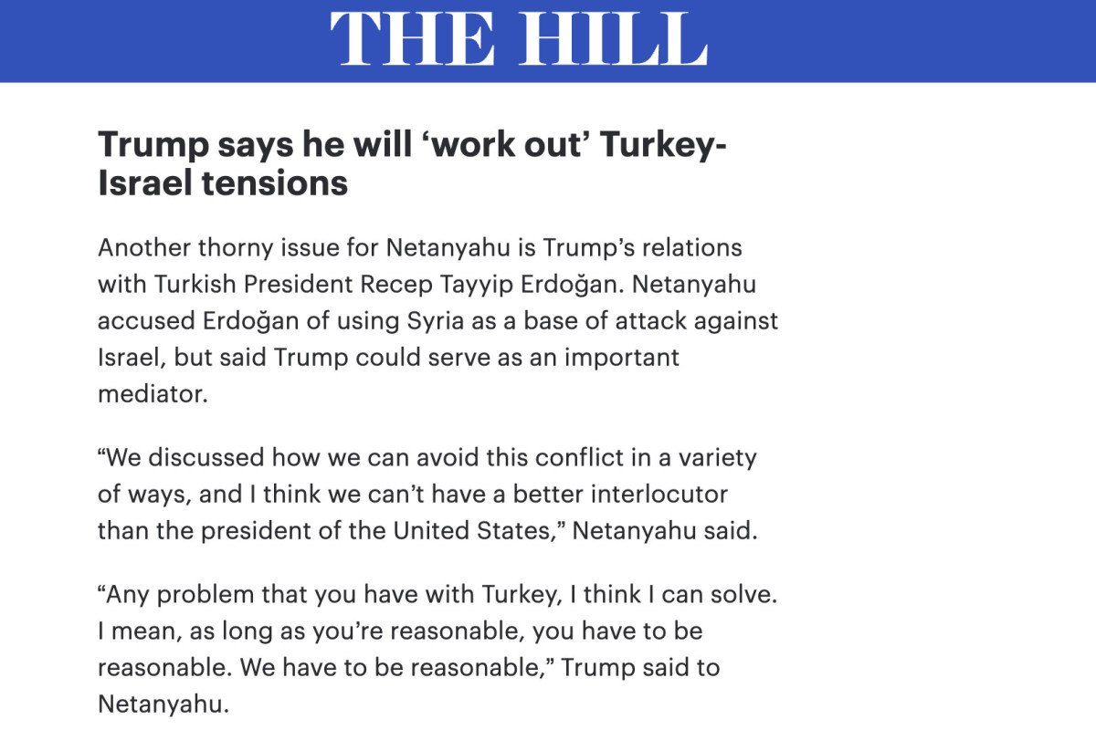 Haberinin içeriğinde, Netanyahu’nun Türkiye’nin ülkesi için büyük bir tehdit olduğunu ve bu husustaki telaşlarını lisana getirdiğini Trump’ın ise “Türkiye ile yaşadığınız her sorunu çözebileceğimi düşünüyorum. Siz makul olduğunuz sürece; bu hususta siz de biz de makul olmalıyız.” sözleri ile karşılık verdiği yazıldı.