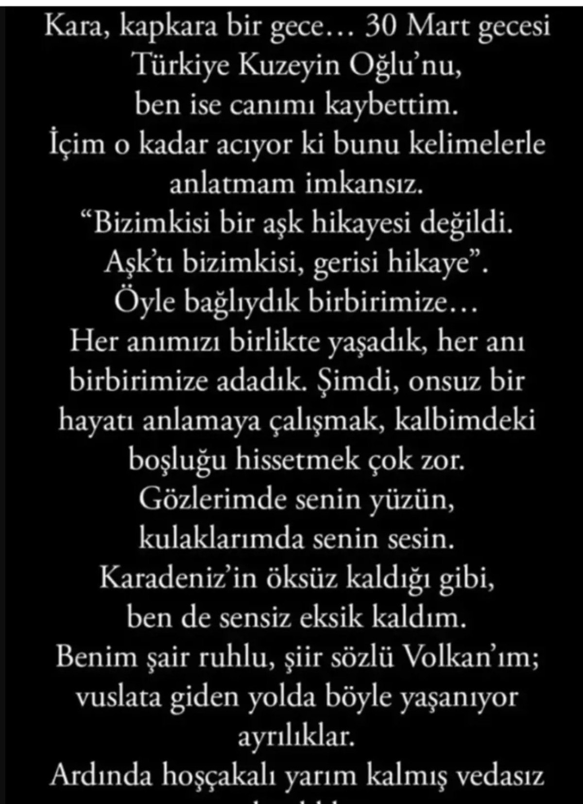 Şimdi onsuz bir hayatı anlamaya çalışmak, kalbimdeki boşluğu hissetmek çok sıkıntı. Gözlerimde senin yüzün, kulaklarımda senin sesin… Karadeniz’in öksüz kaldığı üzere ben de sensiz eksik kaldım. Benim şair ruhlu, şiir kelamlı Volkan’ım… Vuslata giden yolda bu türlü yaşanıyor ayrılıklar… Arkasında hoşçakalı yarım kalmış vedasız yalnızlıklar…Yeniden kavuşacağımız güne dek!”