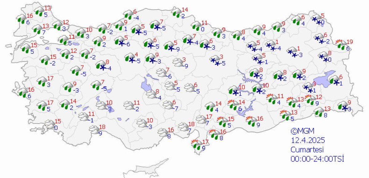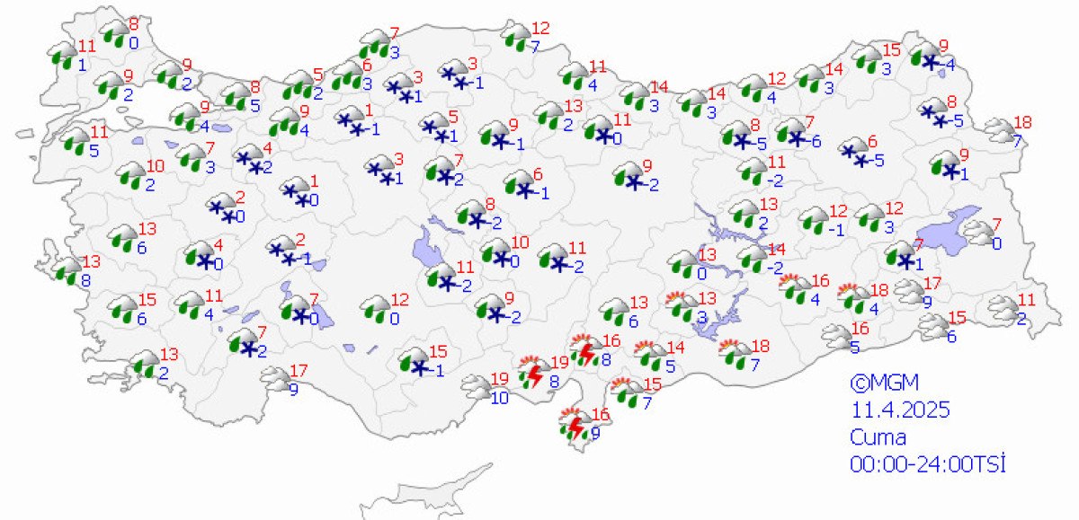 Yağışların ekseriyetle yağmur ve sağanak, Doğu Anadolu’nun güneydoğusu ve Güneydoğu Anadolu’da yer yer gök gürültülü sağanak, Karadeniz’in iç bölümlerinin yüksekleri ve Doğu Anadolu’nun kuzeyinin yüksekleri ile Kütahya ve Eskişehir etraflarında karla karışık yağmur ve kar formunda olması bekleniyor.