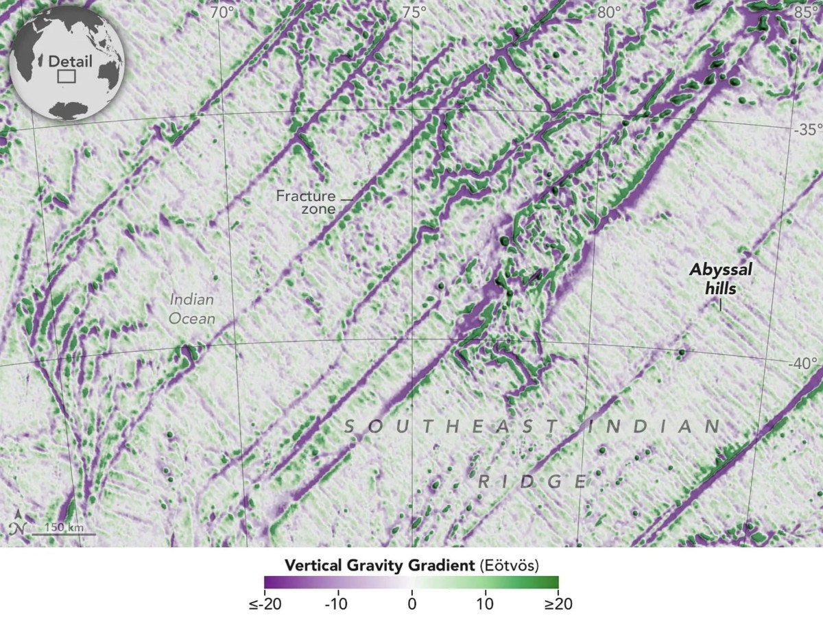Harita üzerinde mor renk, deniz tabanındaki çöküntüleri, yeşil ise daha yüksek kütleli dağlık bölgeleri gösteriyor.