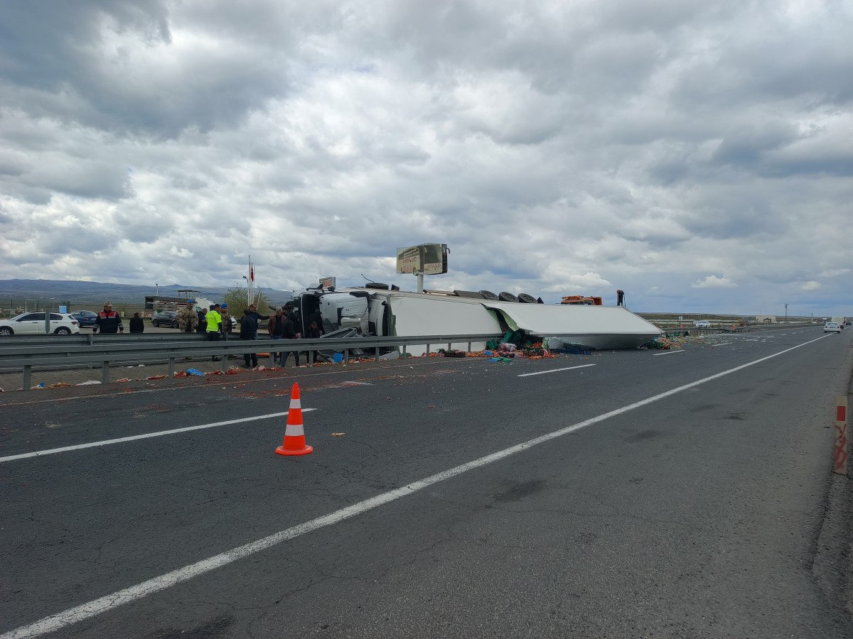 Diyarbakır-Şanlıurfa kara yolununda zerzevat yüklü kamyon, şoförünün direksiyon hakimiyetini kaybetmesi sonucu yol kenarındaki demir bariyerlere çarptı.