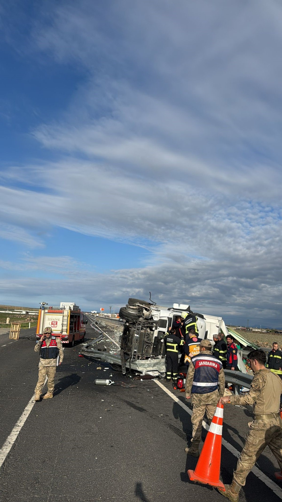Diyarbakır-Şanlıurfa kara yolununda zerzevat yüklü kamyon, şoförünün direksiyon hakimiyetini kaybetmesi sonucu yol kenarındaki demir bariyerlere çarptı.