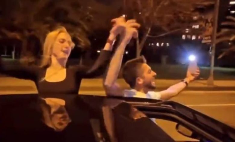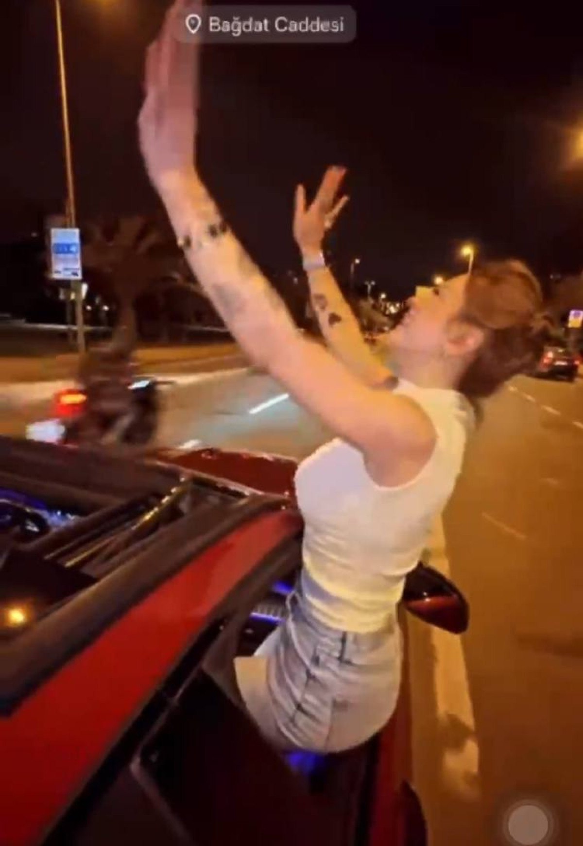 Otomobilin art ve ön kısmında camdan sarkan şahıslar ise müzik eşliğinde dans etti.