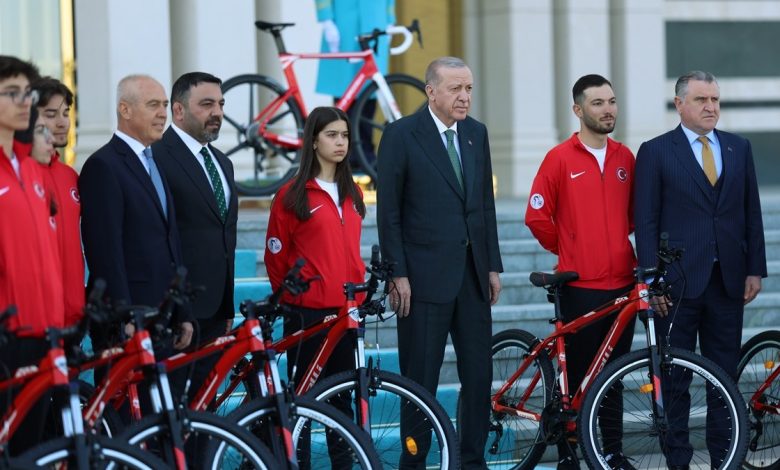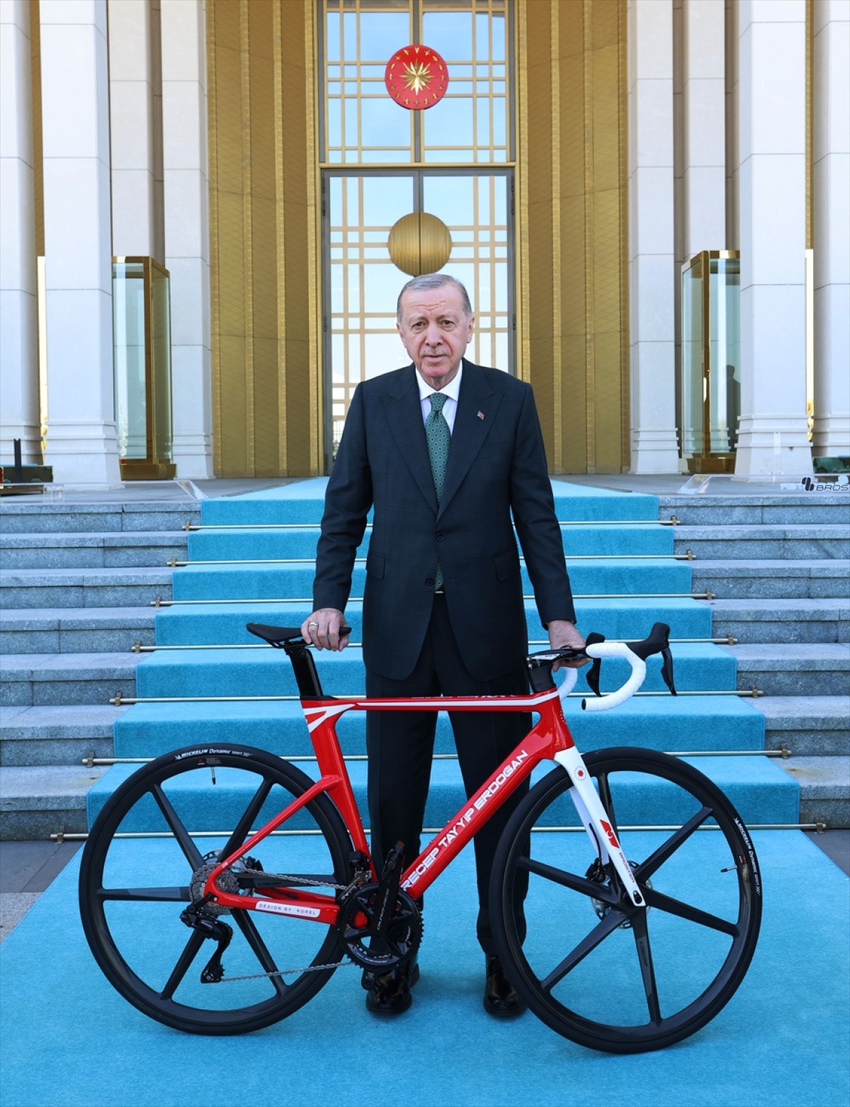 Cumhurbaşkanı Erdoğan’a, üzerinde isminin yazılı olduğu bisiklet takdim edildi.