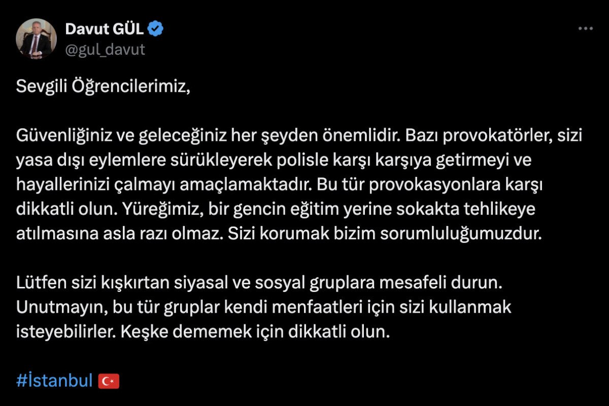 Paylaşımında öğrencilere seslenen İstanbul Valisi, “Bazı provokatörler sizi yasa dışı hareketlere sürükleyerek polisle karşı karşıya getirmeyi ve hayallerinizi çalmayı amaçlamaktadır.” dedi.