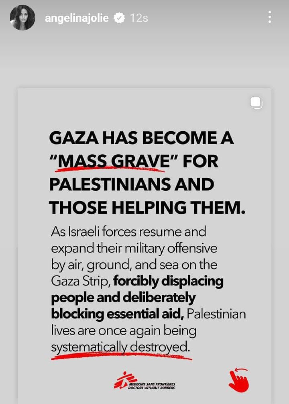 Sınır Tanımayan Hekimler (MSF) sayfasına ilişkin bir gönderiyi öyküsüne ekleyen Jolie’nin paylaşımında, “Gazze, Filistinliler ve onlara yardım eden beşerler için bir toplu mezara dönüştü” sözleri yer aldı.