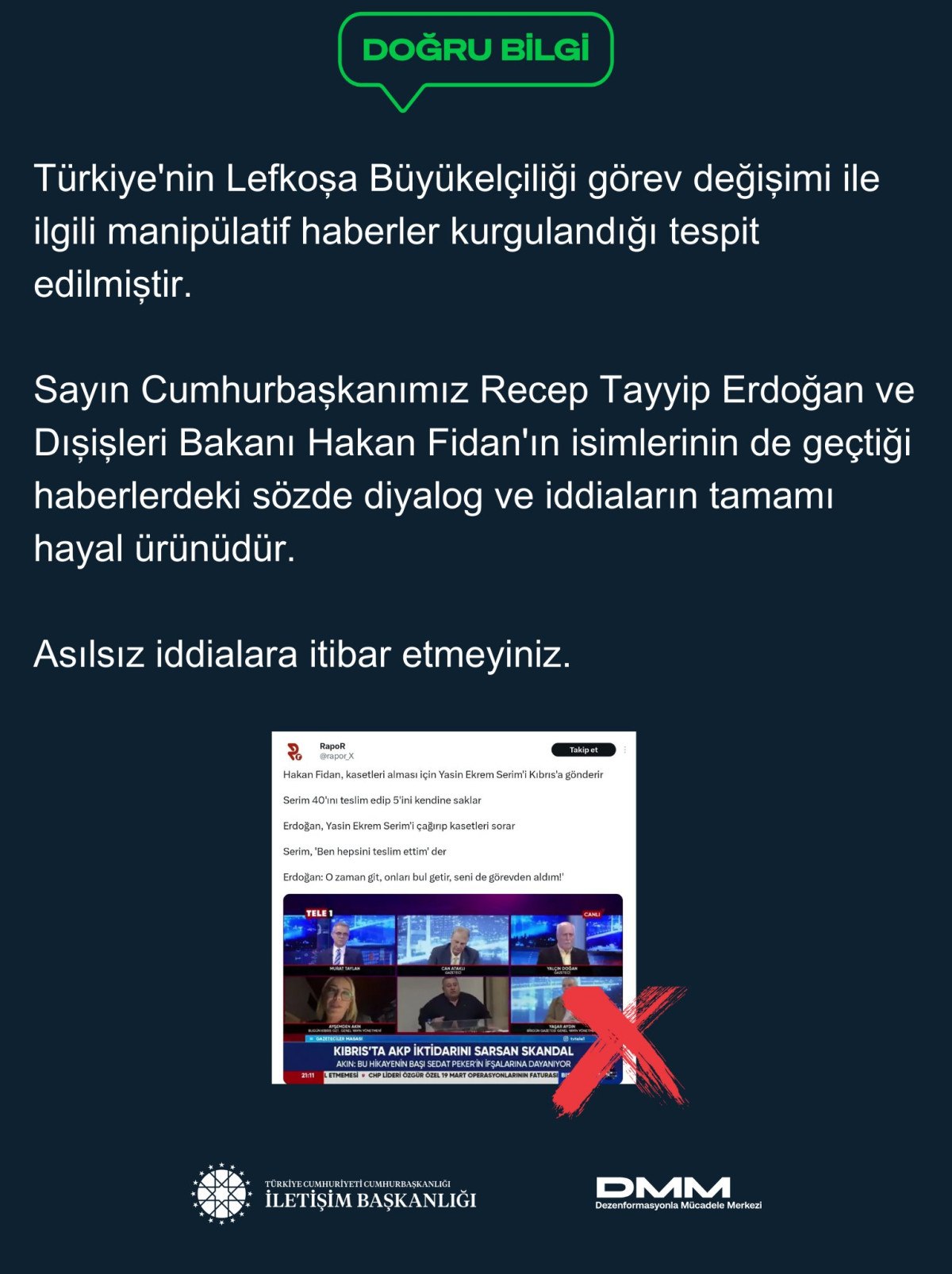 Türkiye’nin Lefkoşa Büyükelçiliği misyon değişimi ile ilgili manipülatif haberlerin gündem olması üzerine Dezenformasyonla Çaba Merkezi (DMM), açıklamada bulunmuştu.