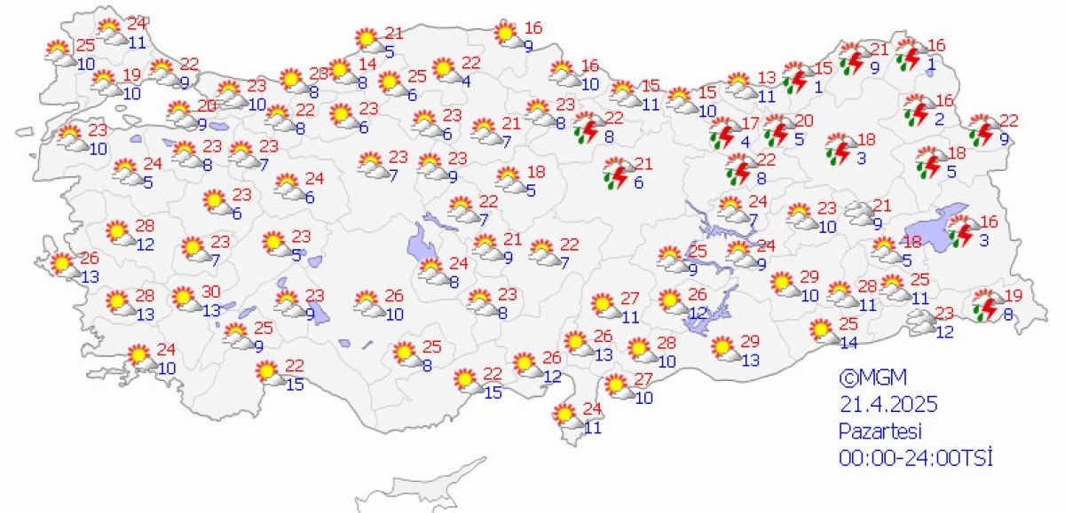 21 Nisan Pazartesi günü, batı bölgelerde güneşli hava devam ederken, İzmir ve Antalya’da sıcaklıkların 22-29 aralığında olması bekleniyor.