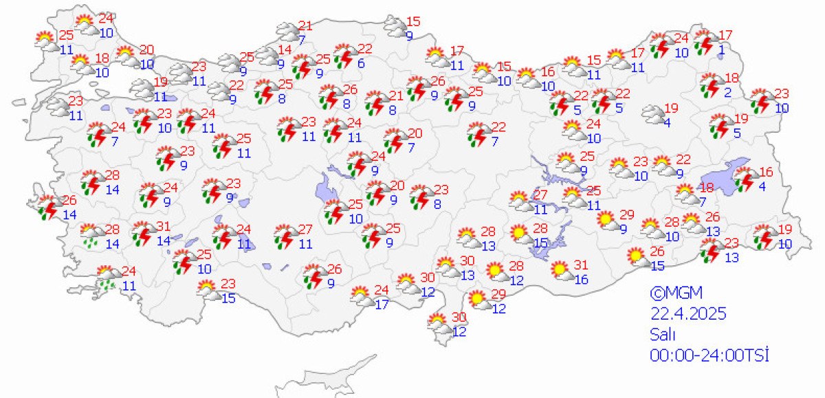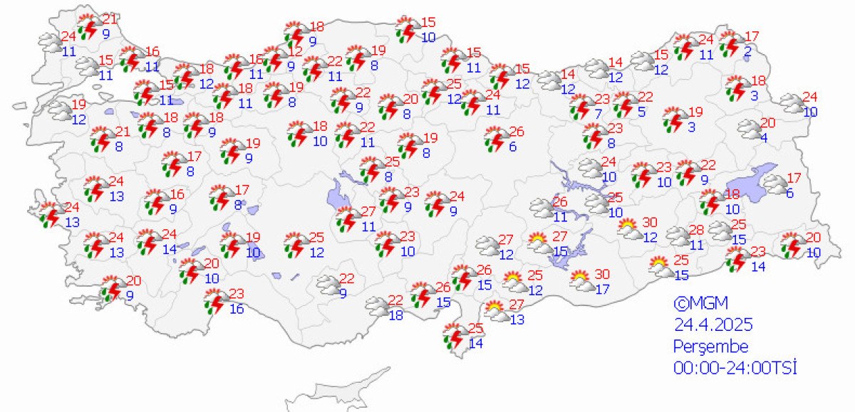 24 Nisan Perşembe günü ise Ege ve Akdeniz’de güneşli hava devam edecek.