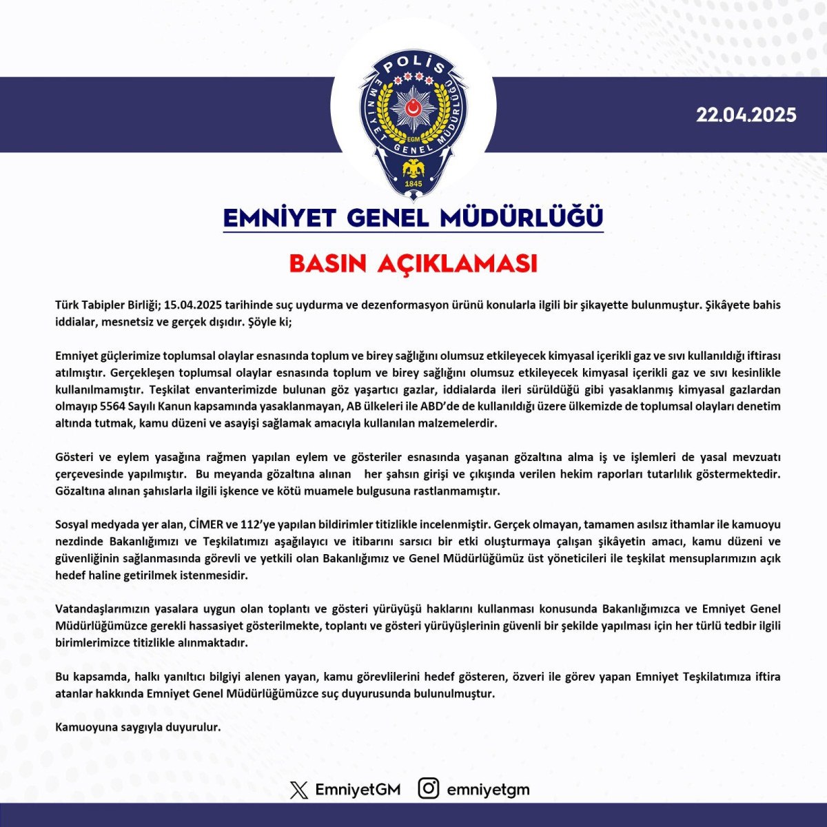 Türk Tabipler Birliği; 15 Nisan 2025 tarihinde hata uydurma ve dezenformasyon eseri hususlarla ilgili bir şikayette bulunmuştur. Şikayete bahis tezler, mesnetsiz ve gerçek dışıdır. Şöyle ki; Emniyet güçlerimize toplumsal olaylar esnasında toplum ve birey sıhhatini olumsuz etkileyecek kimyasal içerikli gaz ve sıvı kullanıldığı iftirası atılmıştır.