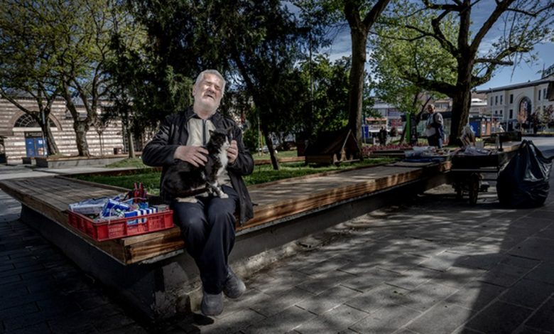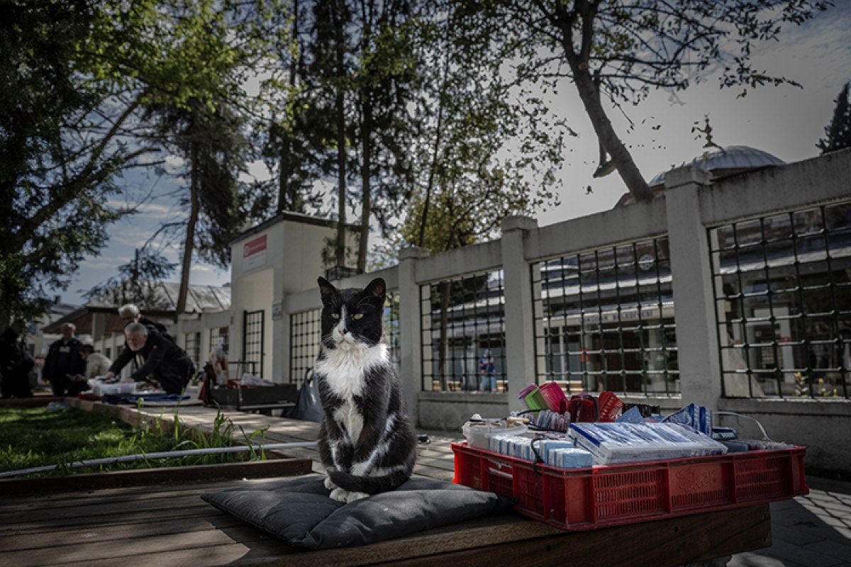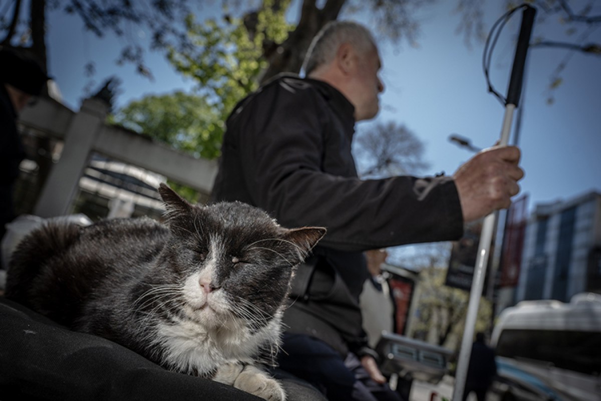 Üsküdar’da sokak kedisi, görme engelli seyyar satıcıya yoldaş oldu