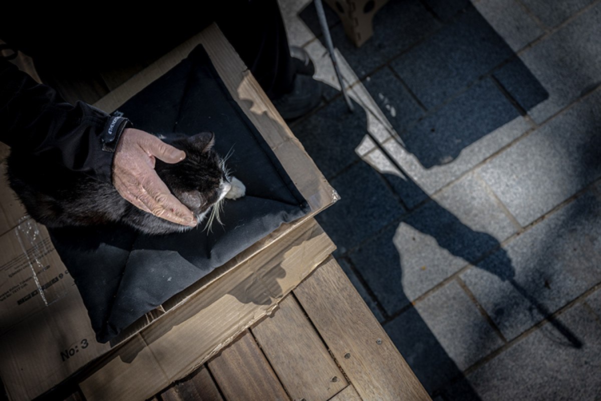 Son iki yıldır hayatının merkezine yerleşen bir yoldaşı var Sever’in: Gölge ismini verdiği bir sokak kedisi. Bilhassa altı ay evvel eşinin vefatıyla birlikte, bu minik dost Mesut Sever’in yalnızca dizinin değil, kalbinin de yoldaşı oldu. Her sabah baston sesini tanıyarak koşarak yanına gelen Gölge, tezgâh kurulurken yerini alıyor, gün uzunluğu ya dizinde ya da onun için özel olarak hazırlanan minderde oturuyor.