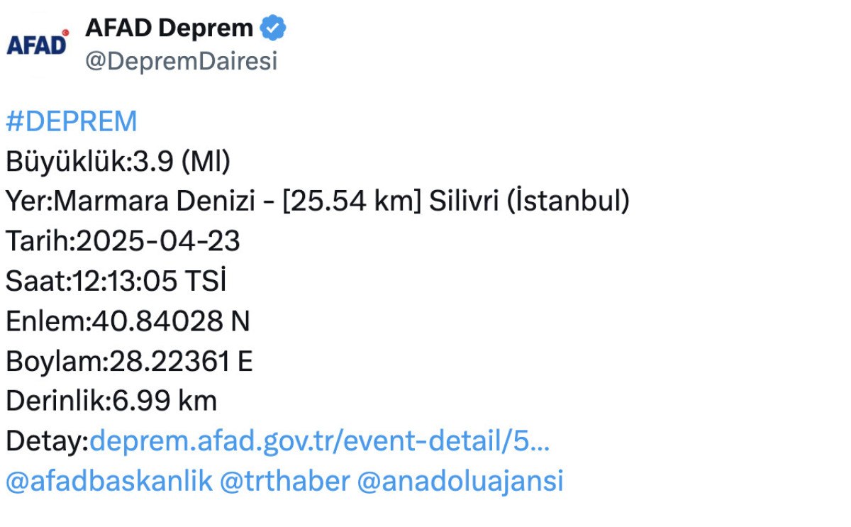 Afet ve Acil Durum İdaresi Başkanlığı, İstanbul’da meydana gelen zelzelenin ayrıntılarını paylaştı.