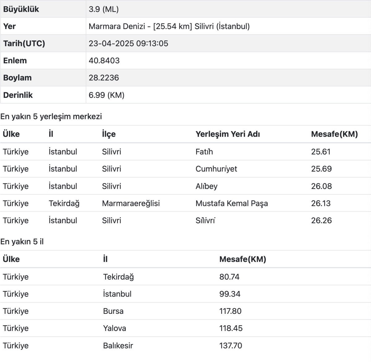 Saat 12.13’te gerçekleşen 3,9’luk zelzele 6.99 kilometre derinlikte meydana geldi.