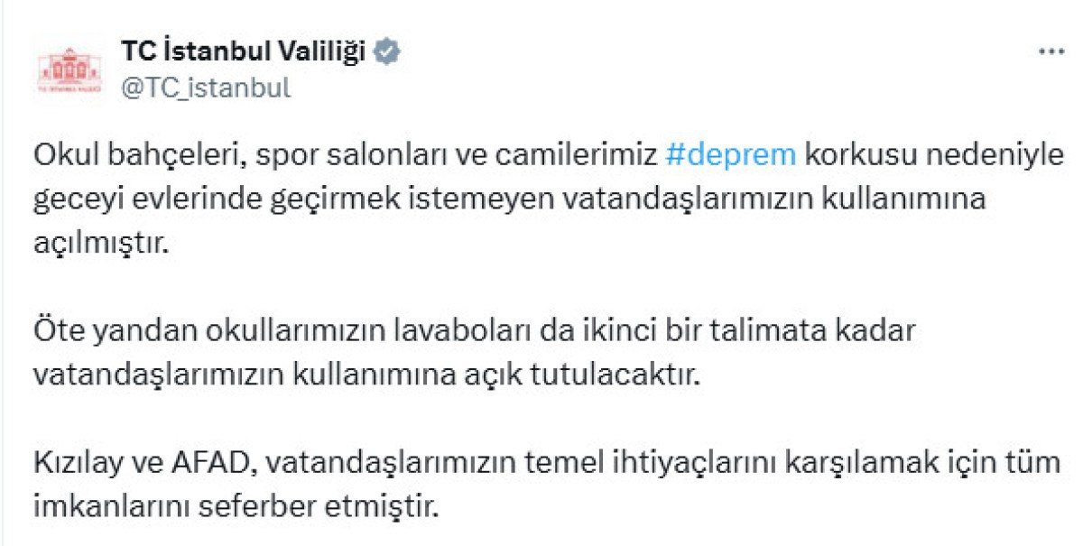 Konuyla ilgili İstanbul Valiliği’nden yapılan açıklamada, sarsıntı endişesiyle meskenlerine giremeyen vatandaşlar için okul bahçeleri, spor salonları ve mescitlerin kullanıma açıldığını duyurdu..