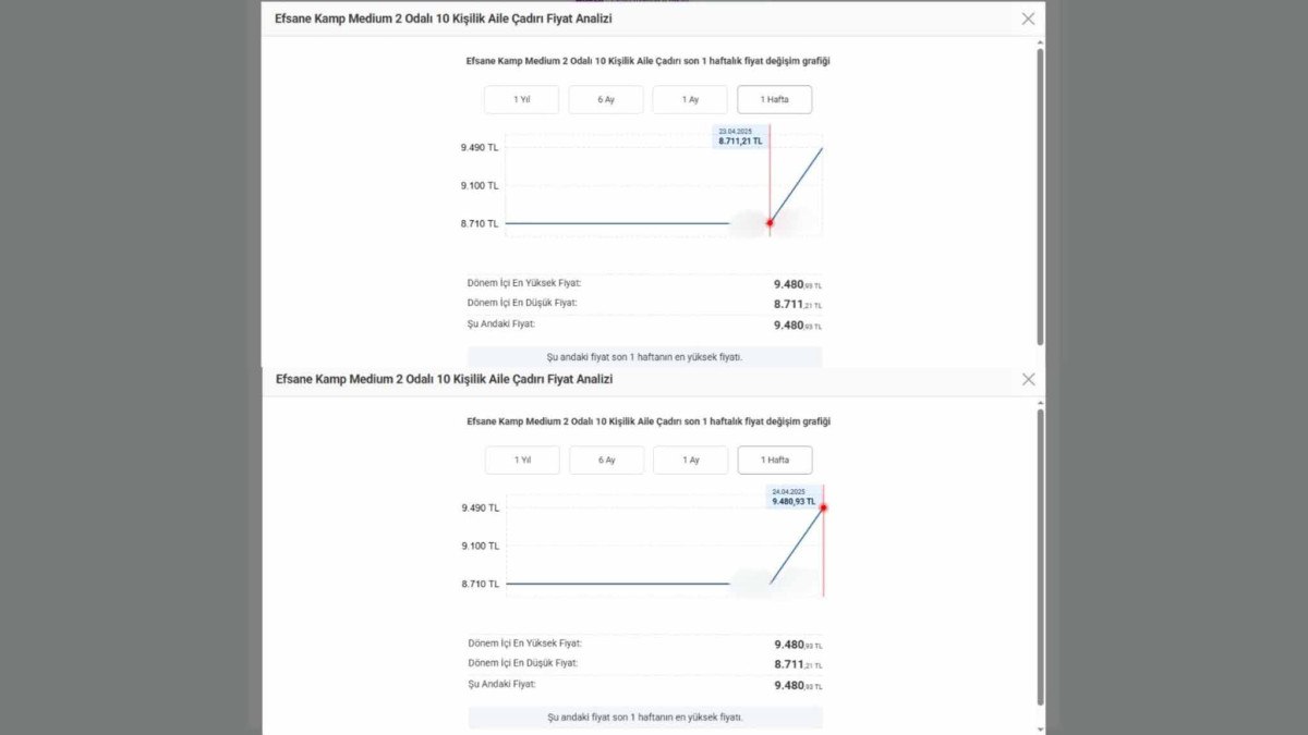 Depremin çabucak öncesinde, 23 Nisan tarihinde 25 bin 415 liradan satışta olan 10 kişilik aile çadırının fiyatı, sarsıntının akabinde 33 bin 915 liraya çıktı. Böylelikle tek bir günde 8 bin 500 liralık artırım yapıldı.