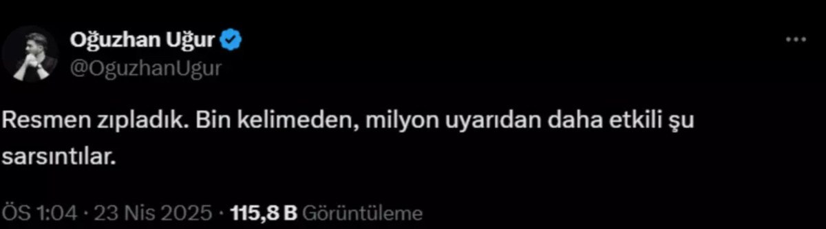 Oğuzhan Uğur paylaşımında “Resmen zıpladık. Bin sözden, milyon ihtardan daha tesirli şu sarsıntılar” diyerek paylaştı.