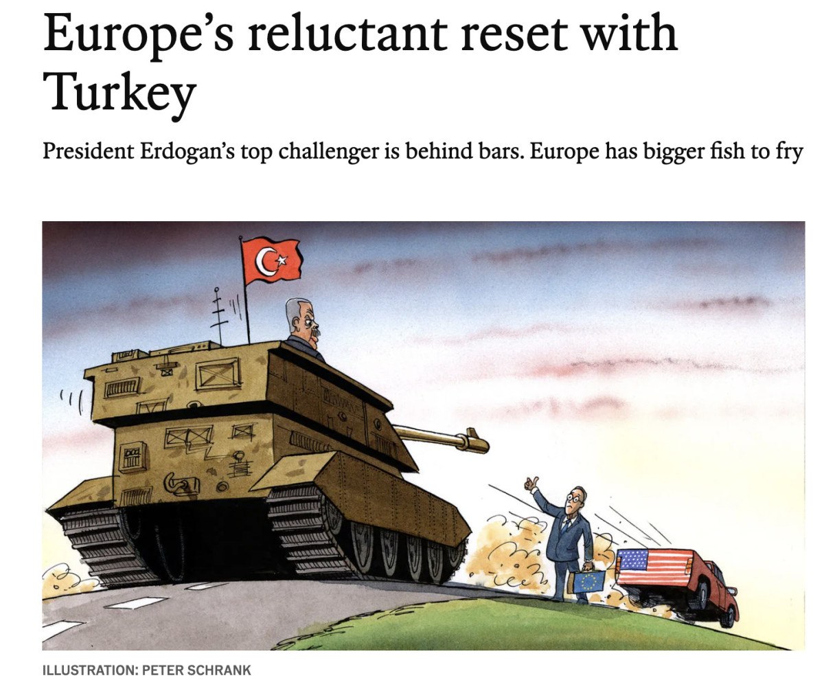 Söz konusu yazıda “Amerika çekiliyor. Rusya’dan gelen tehdit artıyor. Ukrayna savunmada. Yeni harcama vaatlerine karşın, silah üretimi rahatlık için çok düşük kalmaya devam ediyor. Korkmayın Avrupalılar. Recep Tayyip Erdoğan sizin ardınızda. Türkiye’nin cumhurbaşkanı ve Avrupa’nın olası kurtarıcısı 11 Nisan’da, ‘Avrupa güvenliği Türkiye olmadan düşünülemez.” sözlerine yer verildi.