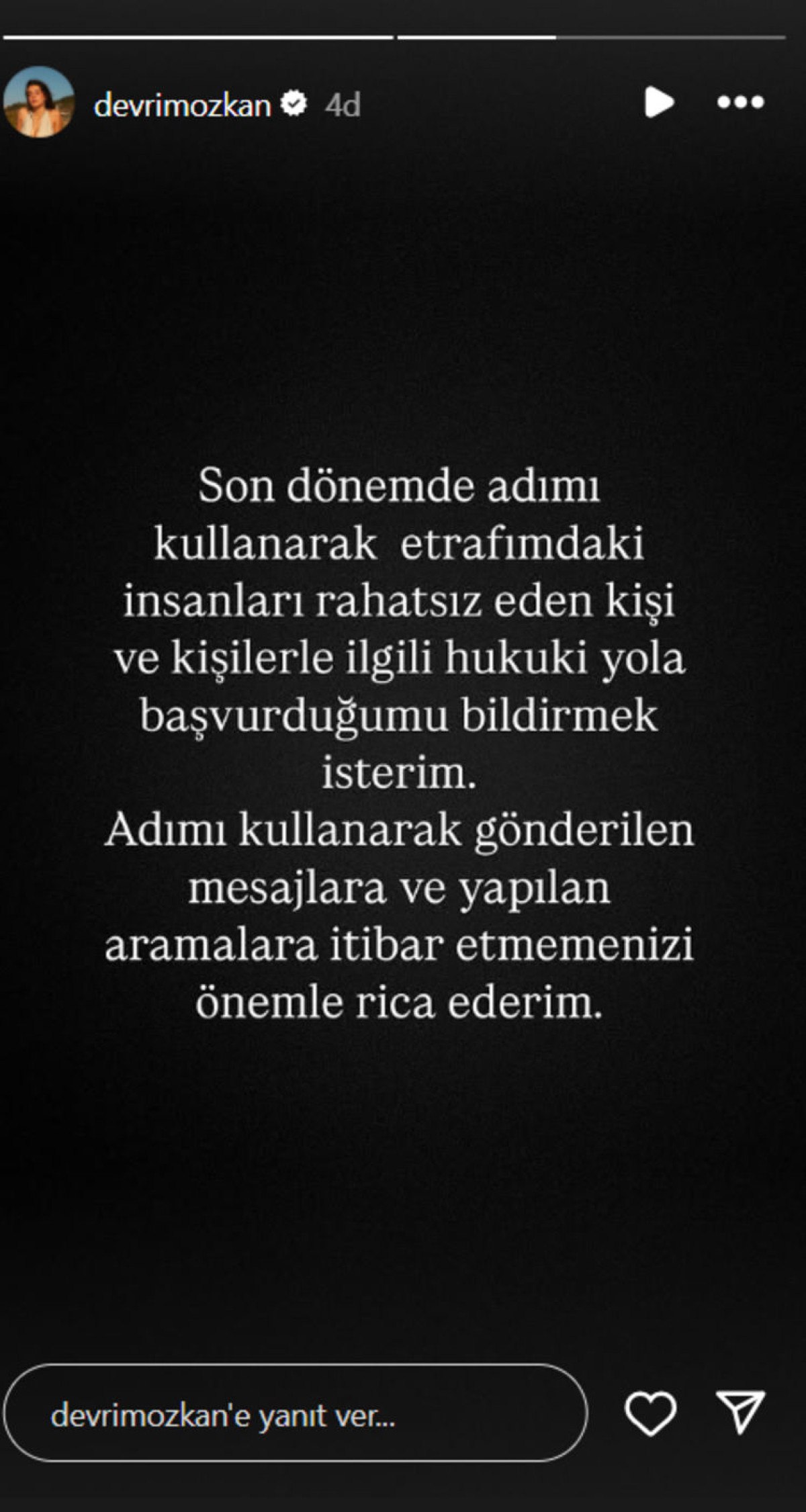 Sosyal medya hesabından bir açıklama yapan Özkan, “Son vakitlerde adımı kullanarak etrafımdaki insanları rahatsız eden kişi yahut şahıslar hakkında türel süreci başlattığımı bildirmek isterim.