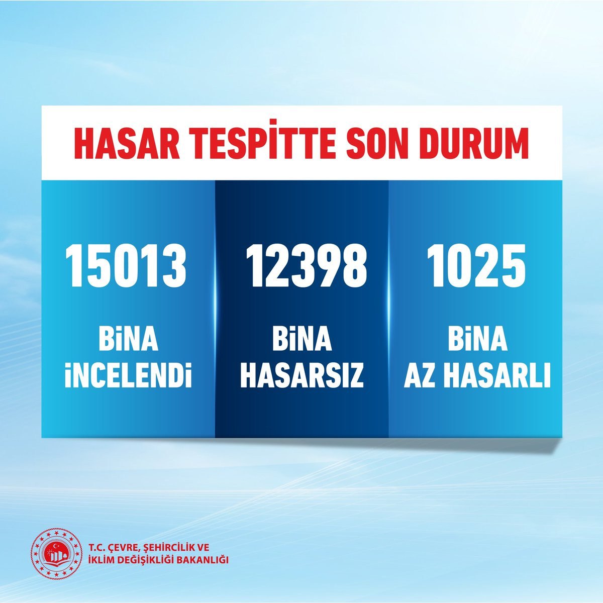 Şu ana kadar; 15.013 binayı inceledik. 12.398 binanın hasarsız, 1.025 binanın az hasarlı olduğunu tespit ettik” iletisini paylaştı.