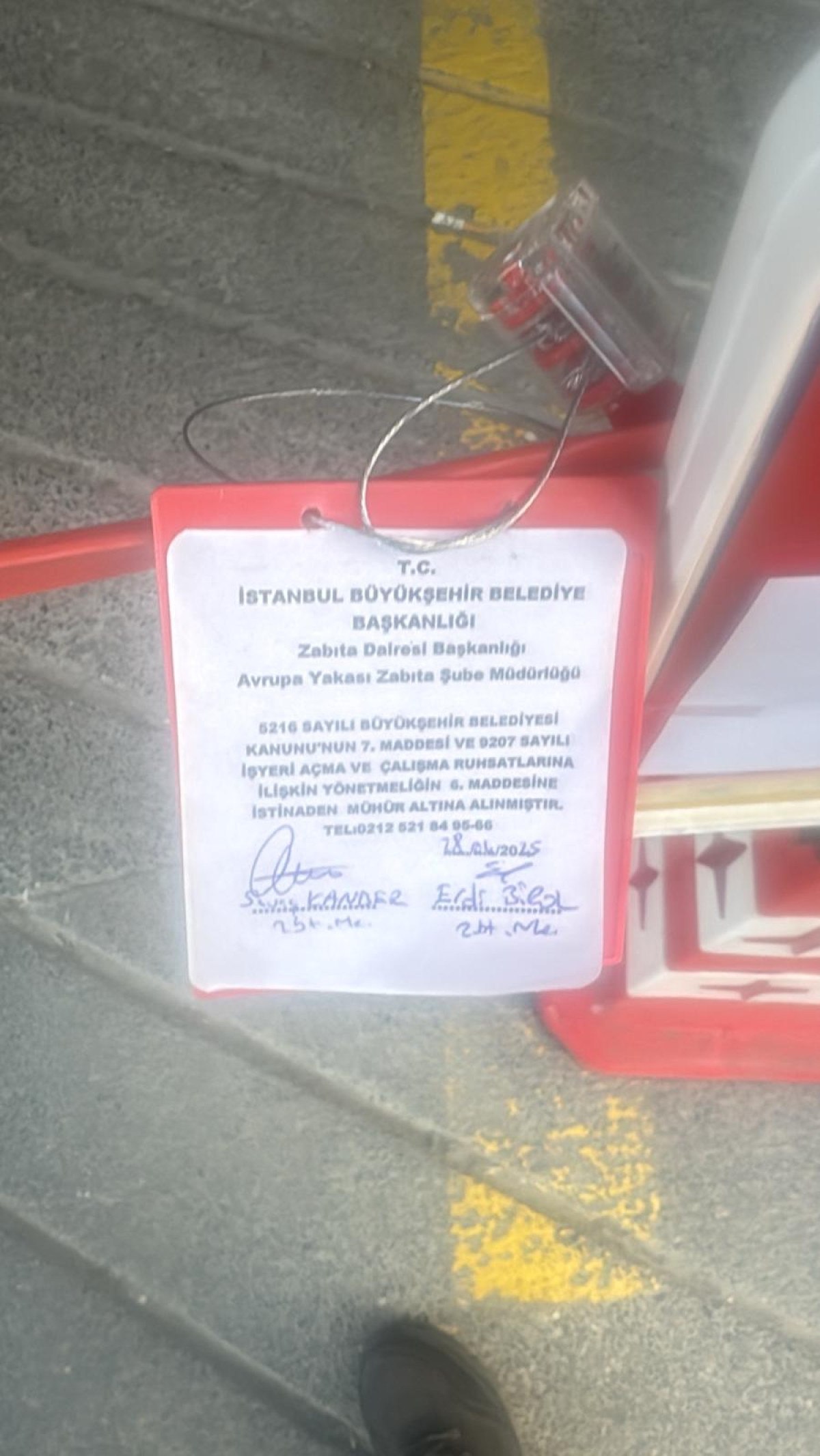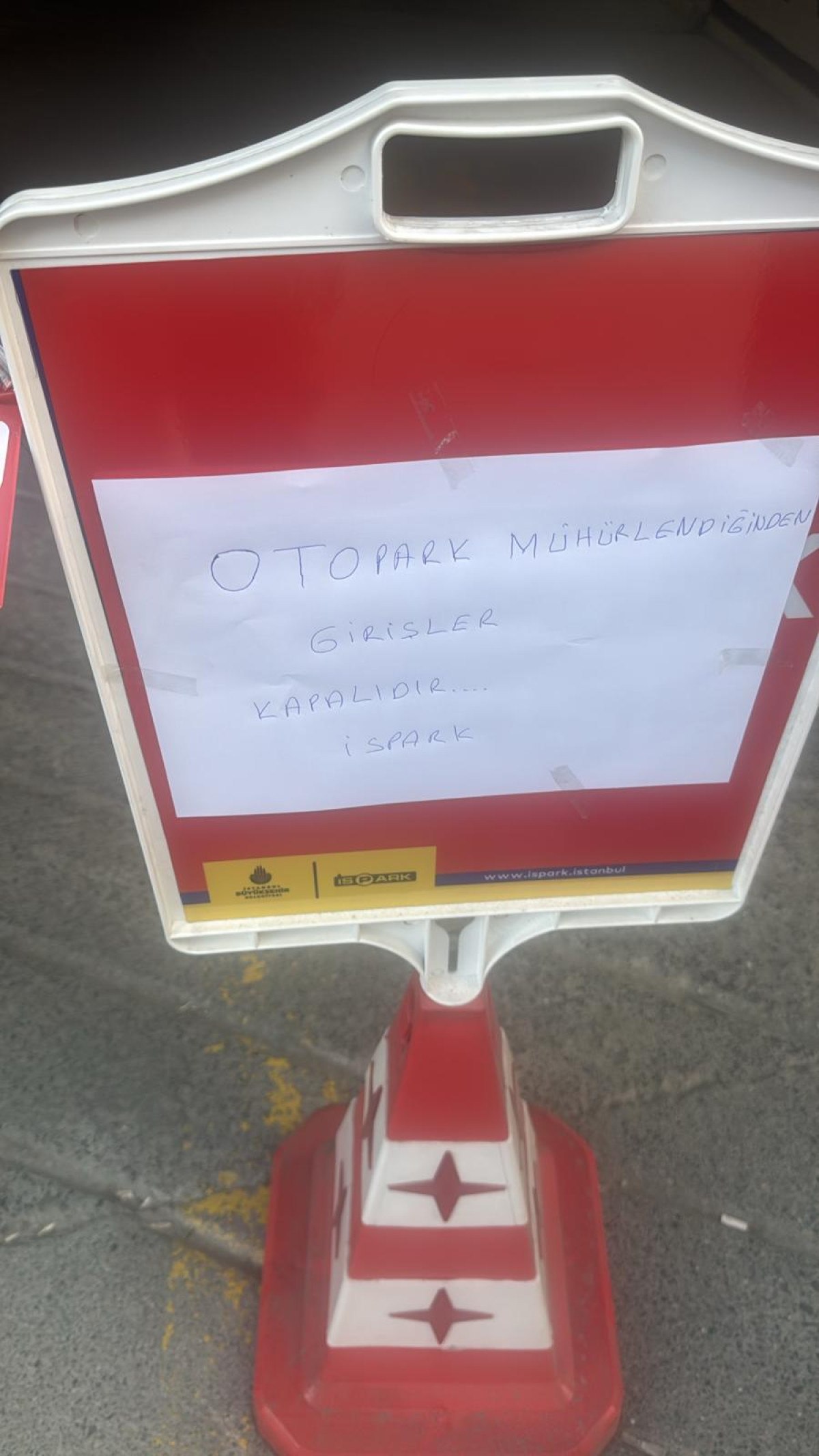 Bağcılar Kent Meydanı Yer Altı Otoparkı’nın girişinde bulunan dubanın üzerine, “Kapalı, mühürlü” yazısının yer aldığı kağıt yapıştırıldığı görüldü.