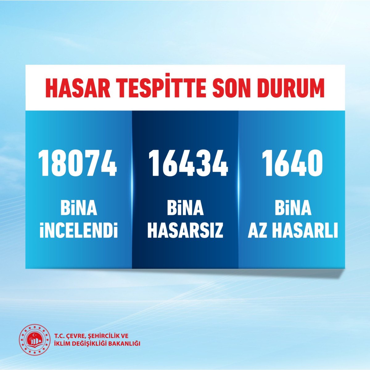 18 bin 74 binayı inceledik. 16 bin 434 binanın hasarsız, 1640 binanın az hasarlı olduğunu tespit ettik. Hasar tespit çalışmalarımızın tamamlanmasıyla gerekeni yapacağız.