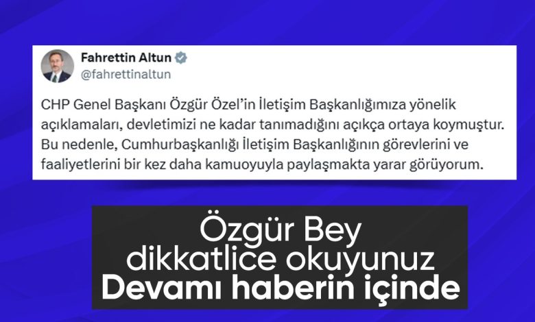 Cumhuriyet Halk Partisi Genel Lideri Özgür Özel’in Bağlantı Başkanlığı’na yönelik açıklamalarıyla devleti ne kadar tanımadığını açıkça ortaya koyduğunu belirten Cumhurbaşkanlığı İletişim Başkanı Fahrettin Altun, sosyal medya hesabından yaptığı açıklamada Bağlantı Başkanlığı’nın misyonlarını ve faaliyetlerini bir sefer daha kamuoyuyla paylaşmakta fayda gördüğünü bildirdi.