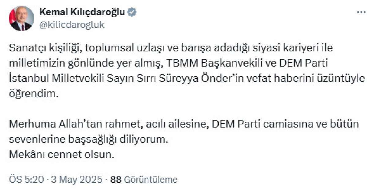 Önder ‘in vefatını hüzünle öğrendiğini belirten Kılıçdaroğlu, şu tabirleri kullandı: