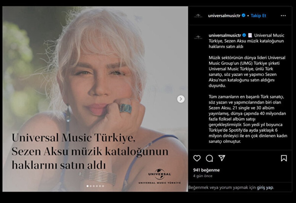 Universal Music Group’un satın aldığı katalog, Sezen Aksu’nun bugüne kadar yayınladığı 21 single ve 30 albümden oluşuyor.