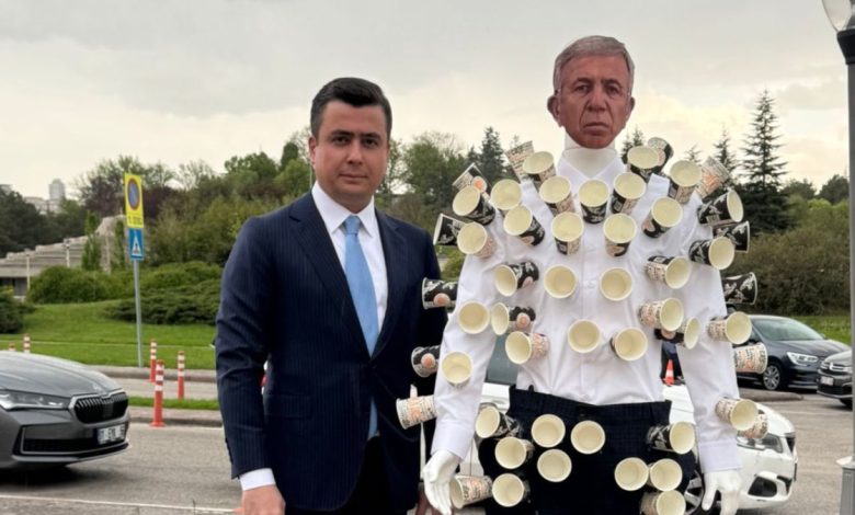 ABB idaresinin kefen alımında yolsuzluğa karıştığını ortaya çıkardıktan sonra Meclis’e tabutla giriş yapan Vekil Gökçek, bu kez Mansur Yavaş maskesi takılmış cansız bir modelle geldi.