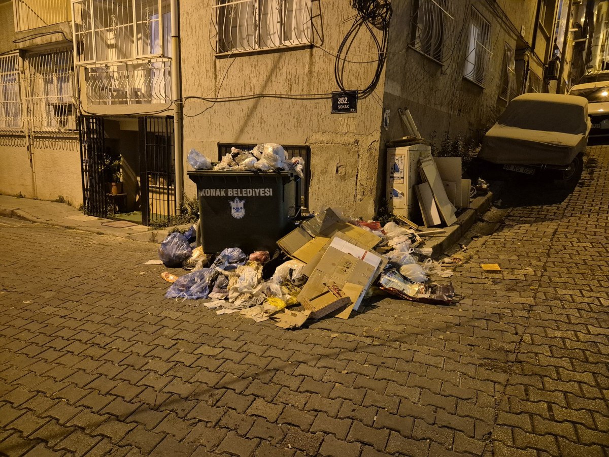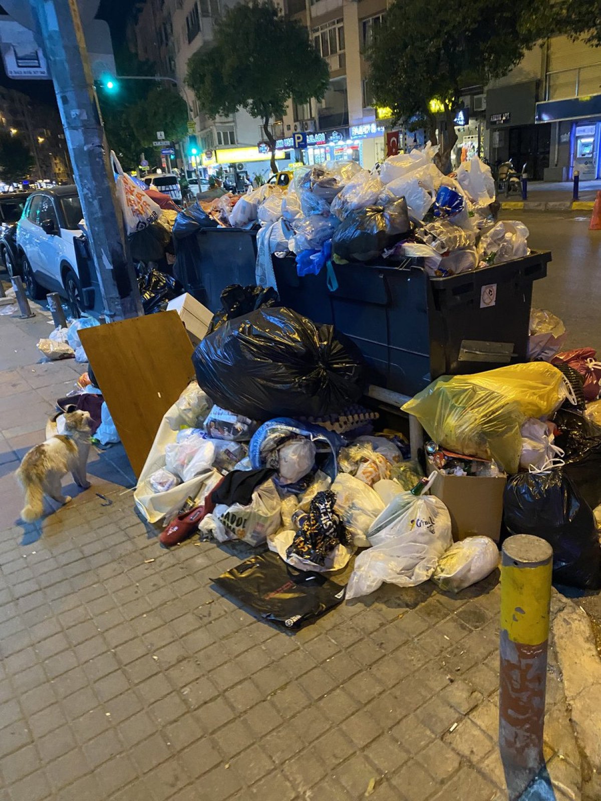 “Yaklaşık 24 saattir çöpler alınmıyor, birbirine yakın başka çöp konteynerleri de dolu. Daima bu sorunu yaşıyoruz.” diyen vatandaşların paylaştığı imajlar ise İzmir’in içler acısı halini ortaya koyuyor.
