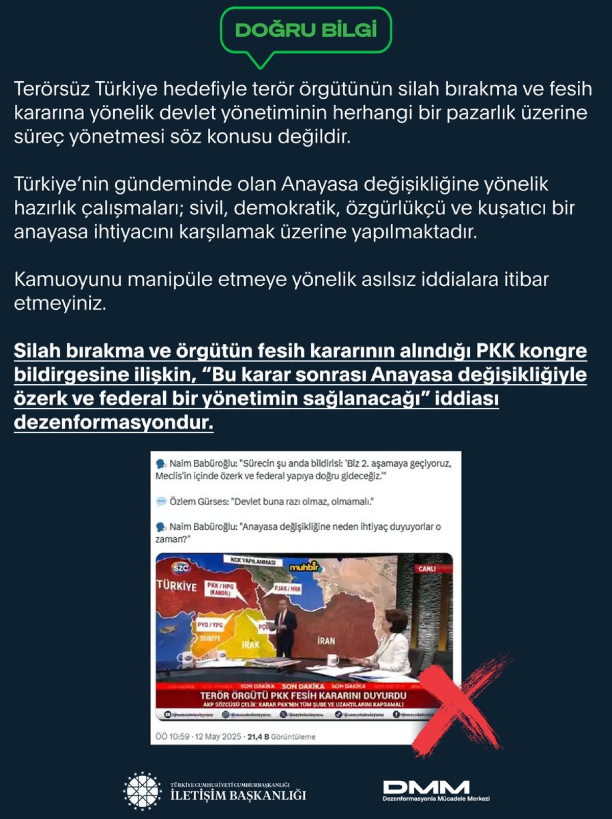 İletişim Başkanlığı Dezenformasyonla Uğraş Merkezi (DMM) de, Silah bırakma ve örgütün fesih kararının alındığı PKK kongre bildirgesine ait, “Bu karar sonrası Anayasa değişikliğiyle özerk ve federal bir idarenin sağlanacağı” savını yalanladı.