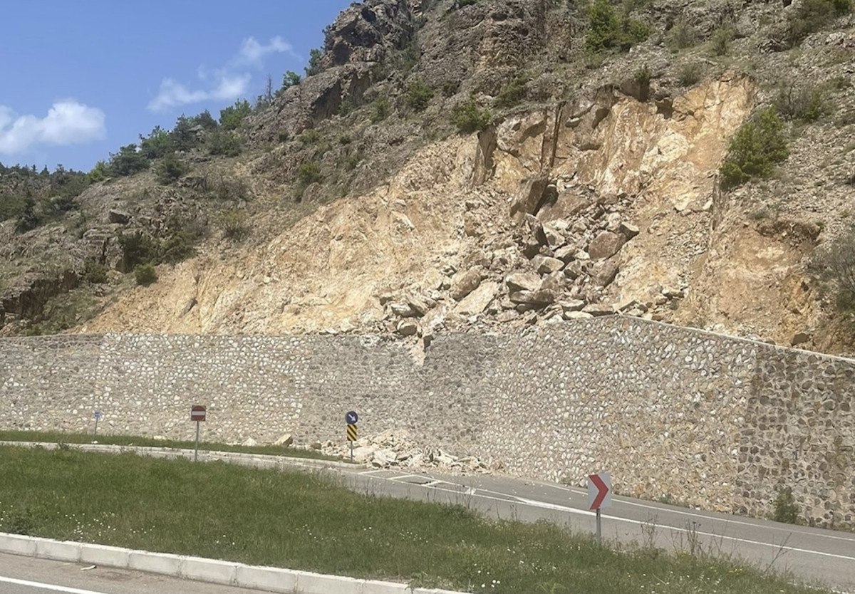 İlçeye bağlı Kaledibi Mahallesi Yarlar mevkiinde, sabah saatlerinde yamaçtan kopan kaya kesimleri yola sürüklendi.