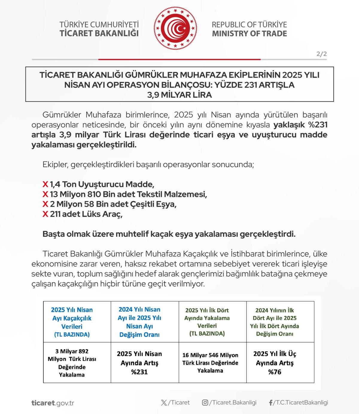 Ocak-Nisan periyodunda düzenlenen 2.349 operasyonda toplam 16,5 milyar TL pahasında kaçak ticari eşya ve uyuşturucu husus ele geçirilirken, sırf Nisan ayında yapılan operasyonların bilançosu geçen yılın birebir ayına nazaran yüzde 231 artışla 3,9 milyar TL’ye ulaştı.