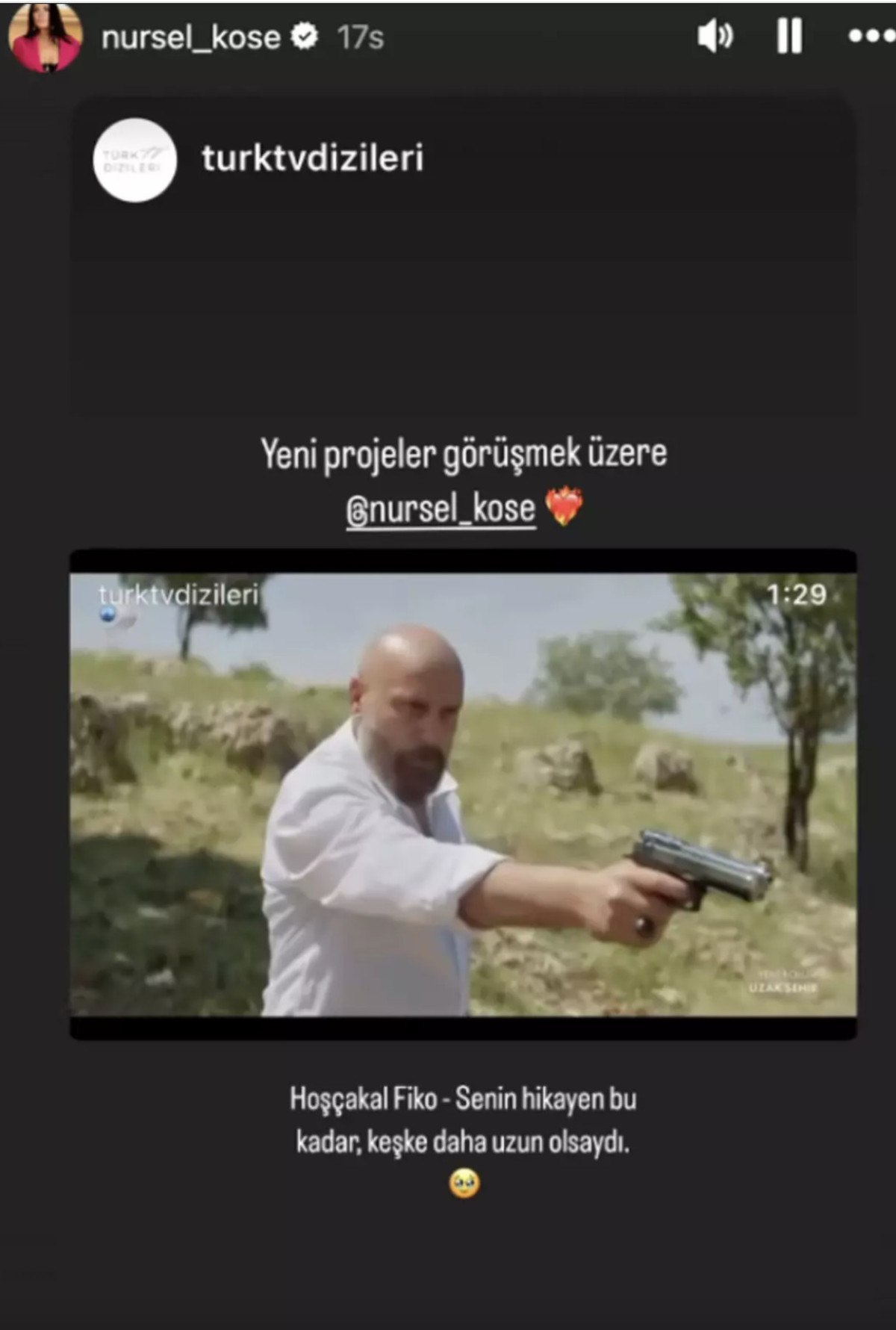 Uzak Kent’in ‘Fikriye’si Nursel Köse veda paylaşımında, ‘Hoşça kal Fiko, Senin öykün bu kadar. Keşke daha uzun olsaydı.’ sözlerine yer verdi.