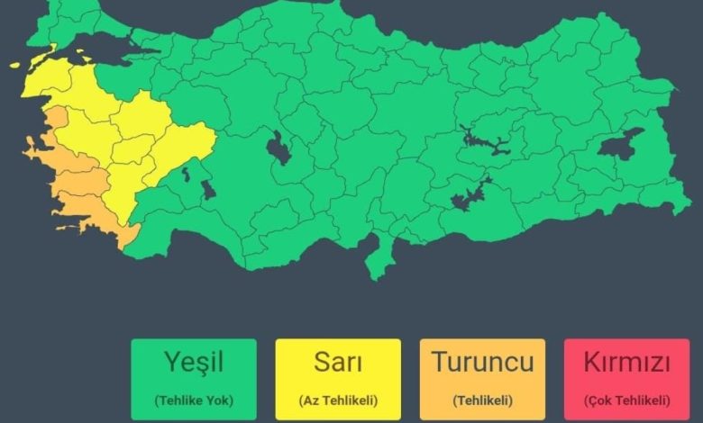 Meteoroloji Genel Müdürlüğü’nden alınan son bilgilere ve yapılan değerlendirmelere nazaran; fırtına nedeniyle Muğla, Aydın, İzmir vilayetlerimiz için turuncu, Çanakkale, Balıkesir, Manisa, Kütahya, Uşak, Denizli, Afyonkarahisar vilayetlerimiz için sarı ikaz verilmiştir.