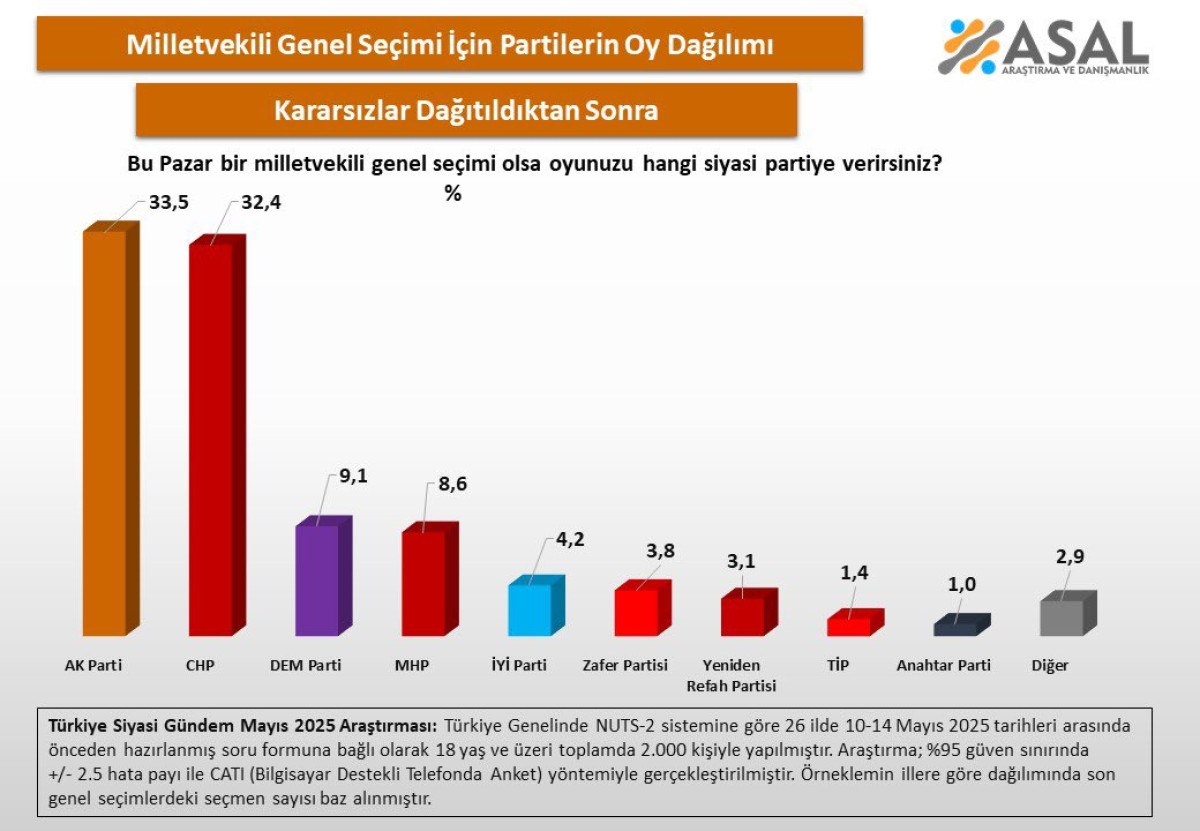 Asal Araştırma, 10-14 Mayıs ortasında tüm Türkiye genelinde 2 bin şahısla görüşerek bir seçim anketi yaptı.