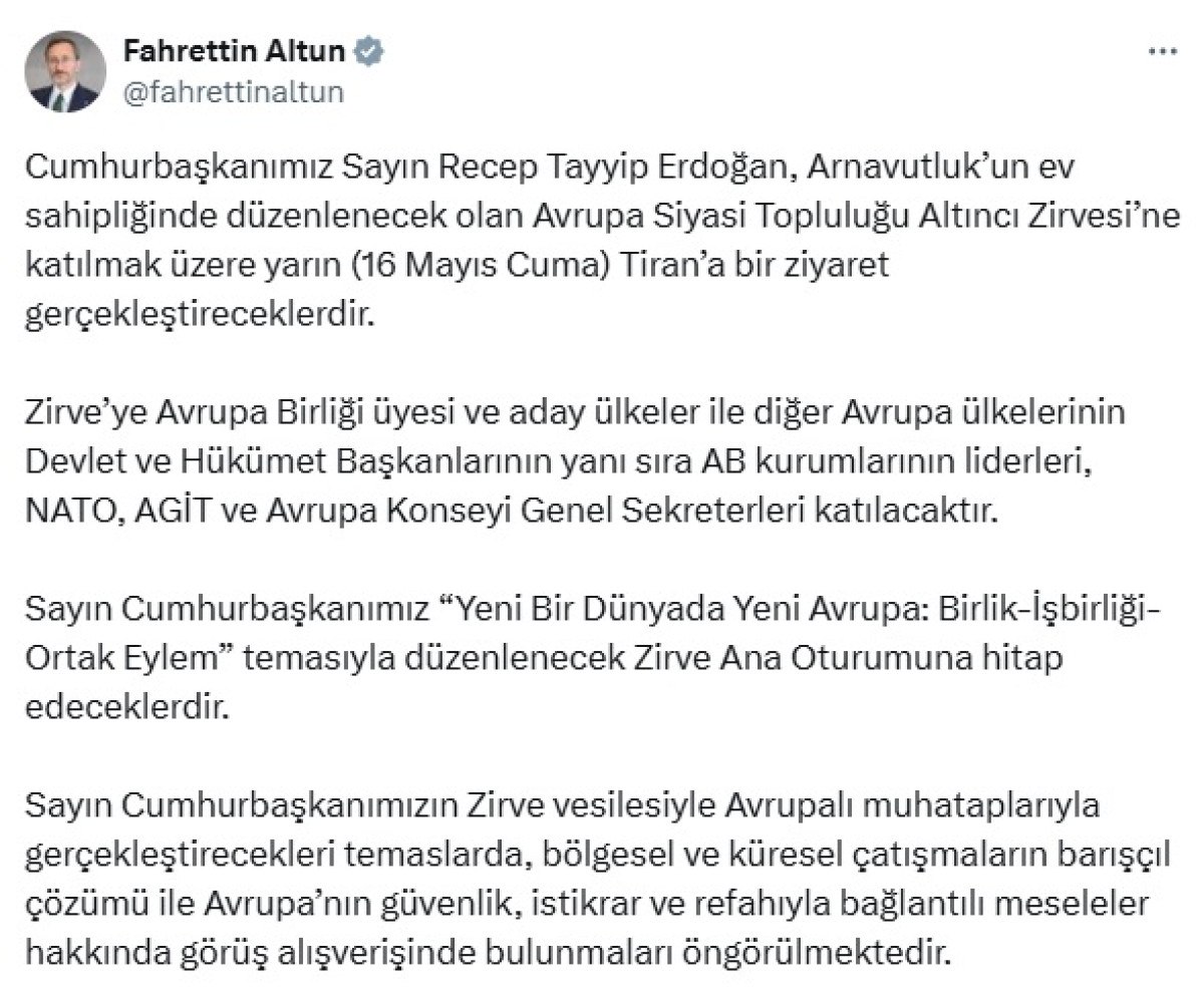 Cumhurbaşkanımız Sayın Recep Tayyip Erdoğan, Arnavutluk’un konut sahipliğinde düzenlenecek olan Avrupa Siyasi Topluluğu Altıncı Doruğu’na katılmak üzere yarın (16 Mayıs Cuma) Tiran’a bir ziyaret gerçekleştireceklerdir.