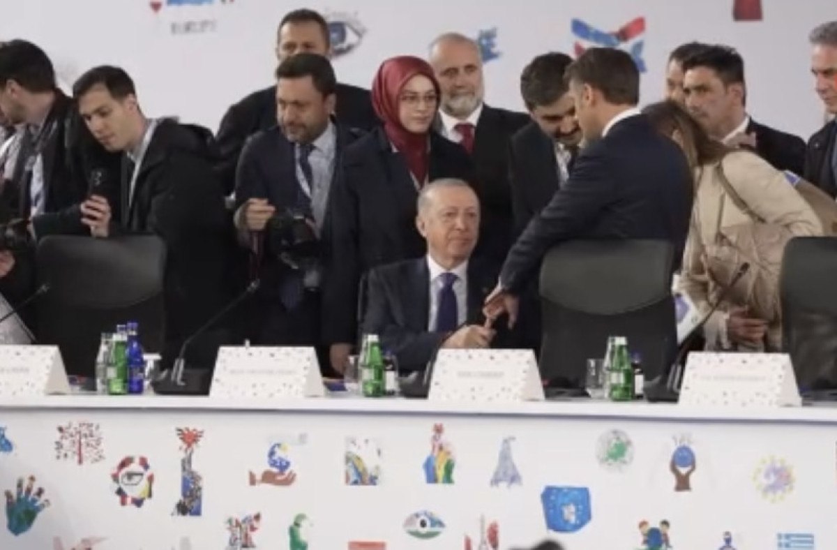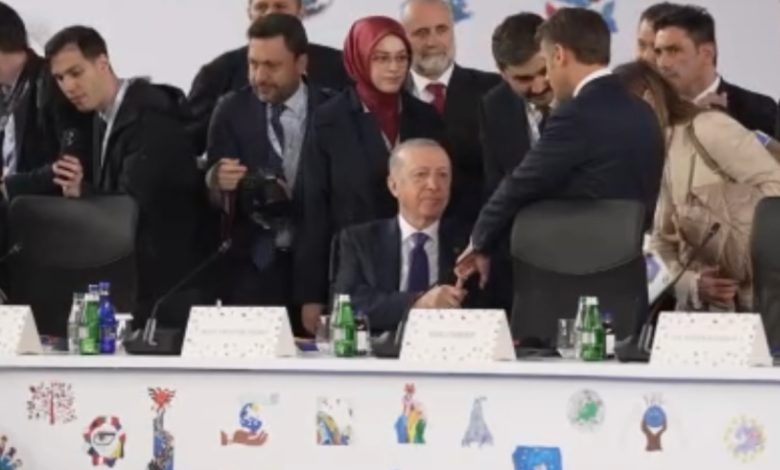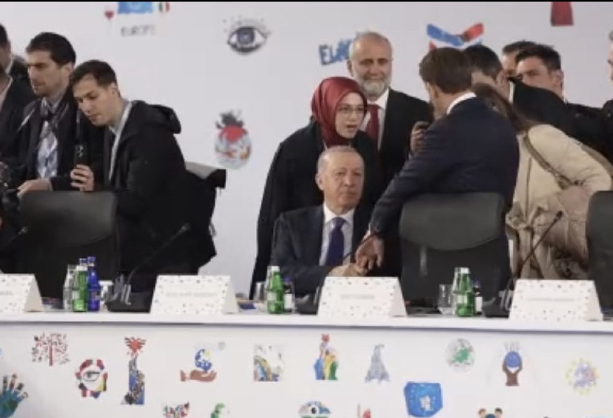 Zirvenin yapılacağı salonda konuşma öncesi Cumhurbaşkanı Erdoğan’ın yanına gelen isimlerden birisi de Fransa Cumhurbaşkanı Emmanuel Macron oldu.