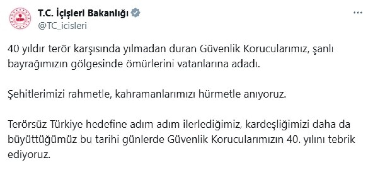 40 yıldır terör karşısında yılmadan duran güvenlik korucularımız, ulu bayrağımızın gölgesinde ömürlerini vatanlarına adadı. Şehitlerimizi rahmetle, kahramanlarımızı hürmetle anıyoruz. Terörsüz Türkiye maksadına adım adım ilerlediğimiz, kardeşliğimizi daha da büyüttüğümüz bu tarihi günlerde güvenlik korucularımızın 40’ıncı yılını tebrik ediyoruz.