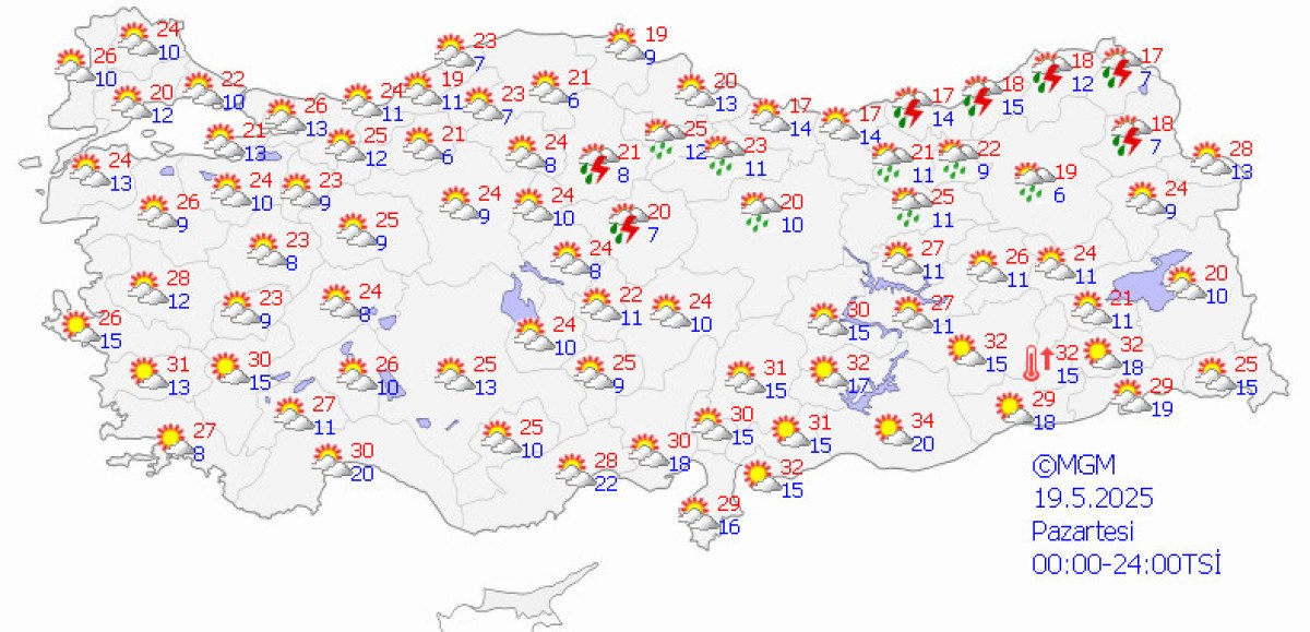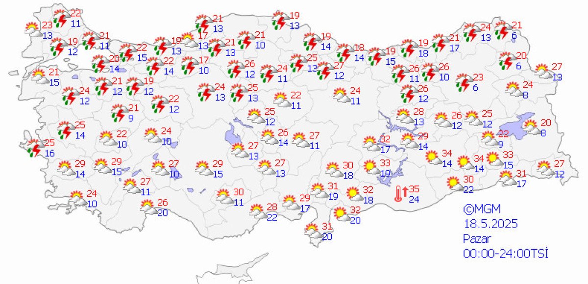 Marmara, Ege Bölgesi (Muğla ve Denizli dışında), Batı Karadeniz (Sinop hariç), İç Anadolu’nun kuzeybatı kesitleri ile Antalya, Isparta ve Kırıkkale etraflarında aralıklı sağanak ve gök gürültülü sağanak yağış görülecek.