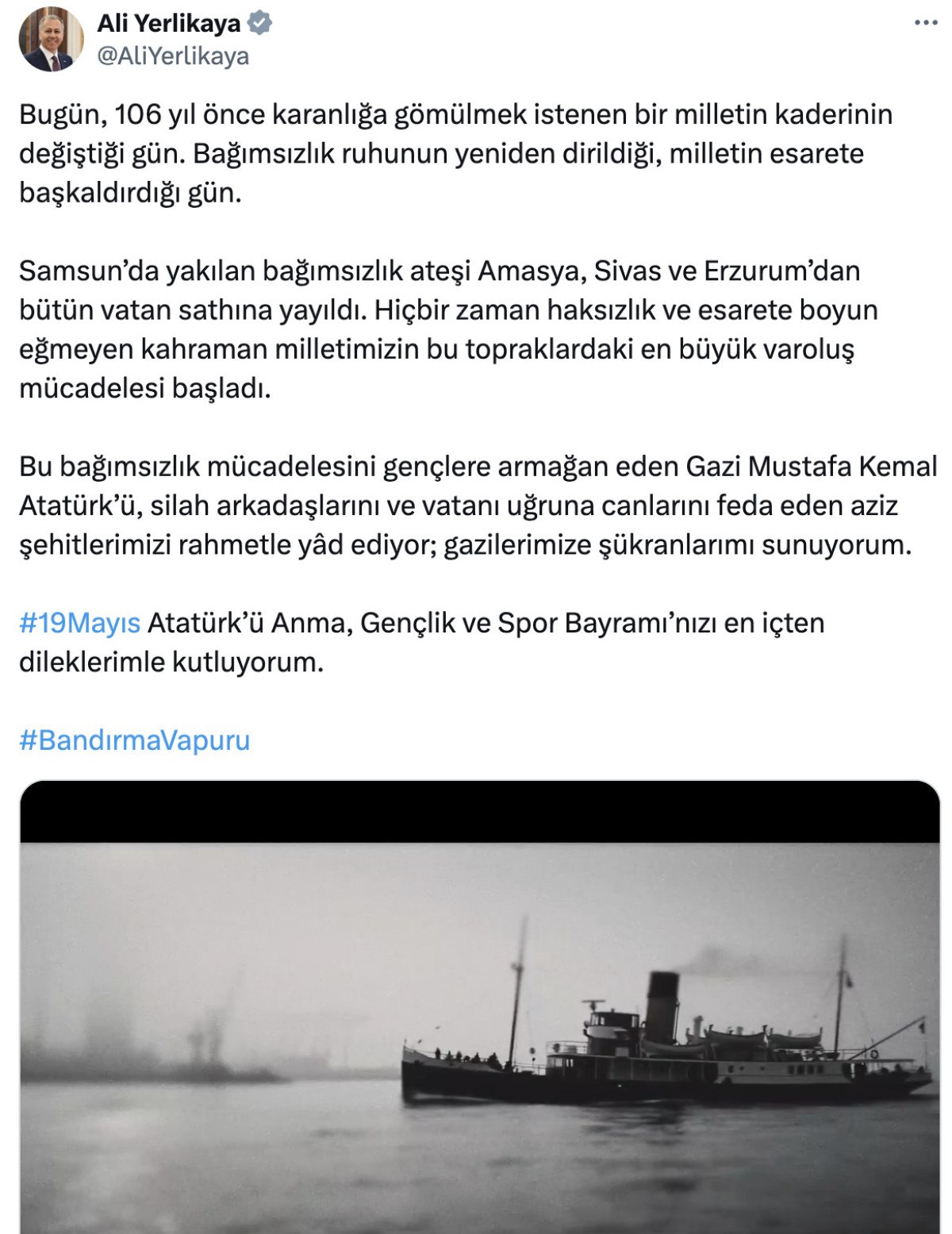 Bugün tüm yurtta 19 Mayıs Atatürk’ü Anma, Gençlik ve Spor Bayramı coşku ile kutlanırken, İçişleri Bakanı Ali Yerlikaya da bir ileti yayımlayarak, “19 Mayıs Atatürk’ü Anma, Gençlik ve Spor Bayramı’nızı en içten dileklerimle kutluyorum.” dedi.