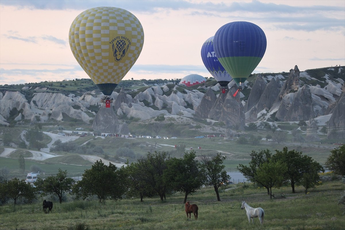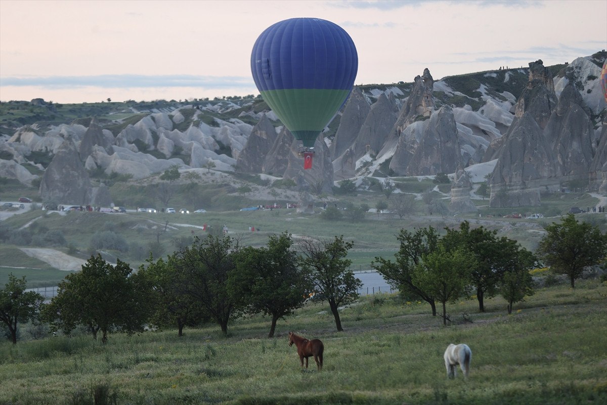 Tura katılan turistlerin sepetlere alınmasının akabinde sıcak hava balonları bölge semalarına yükseldi.